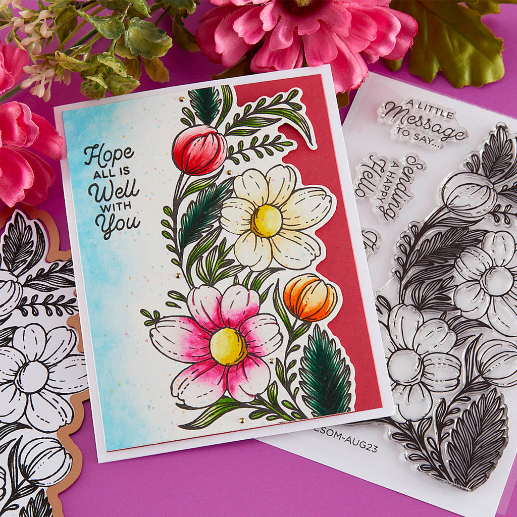 Happy Hello Floral - 7-Piece Set coordinates with the Clear Stamp of the month released August 2023 to our New Clear Stamp + Die of the Month Club.