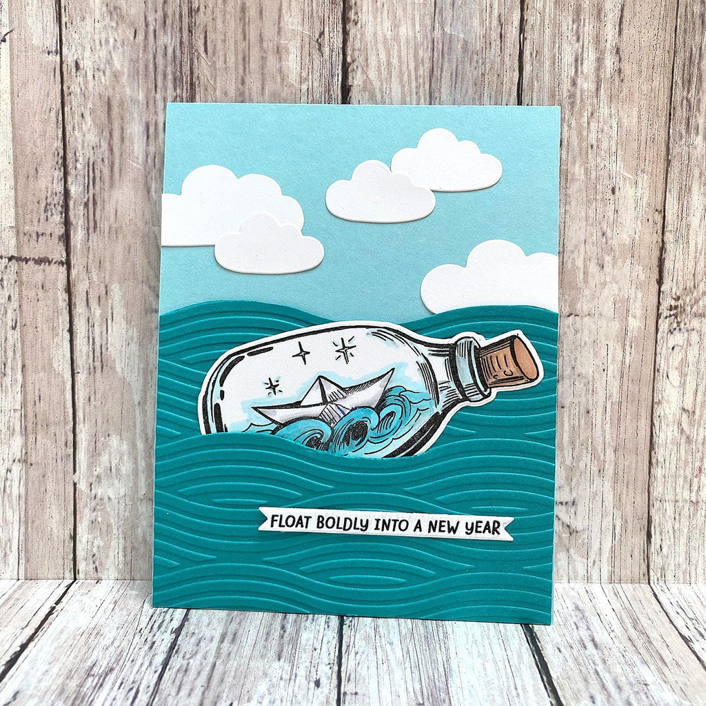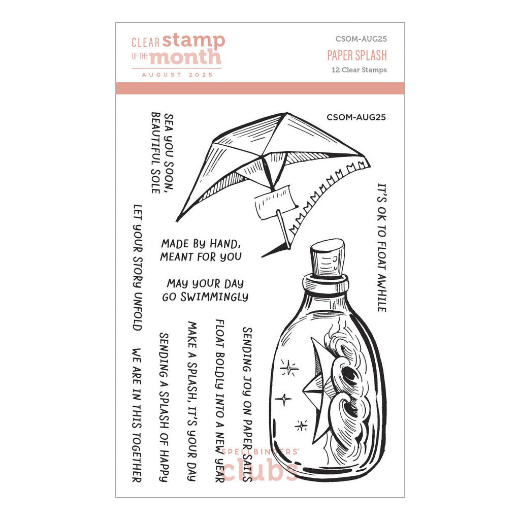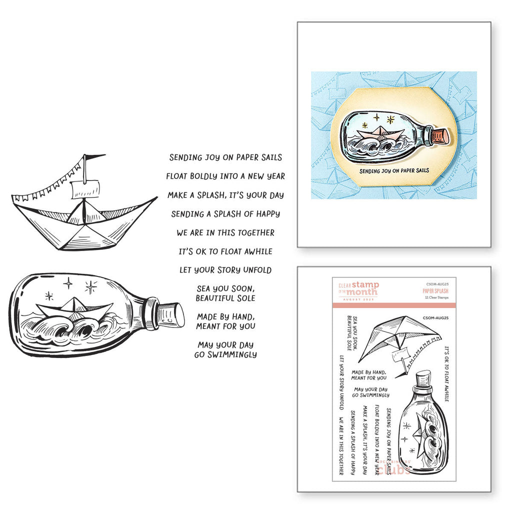 Set sail on new creative adventures with the Paper Splash Clear Stamp of the Month! This charming set features hand-drawn nautical icons including a paper boat, a ship-in-a-bottle, and a collection of uplifting sentiments. Perfect for cards, tags, and journaling, these designs bring a playful mix of whimsy and encouragement to your projects.