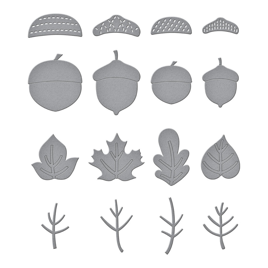 Falling Leaves Etched Dies are from the Autumn Archives Collection by Kelly Bangs. What is the fall season without the leaves and acorns? Make many with this set of 13 thin metal cutting dies! There are four designs and sizes of each acorn and leaf shapes.