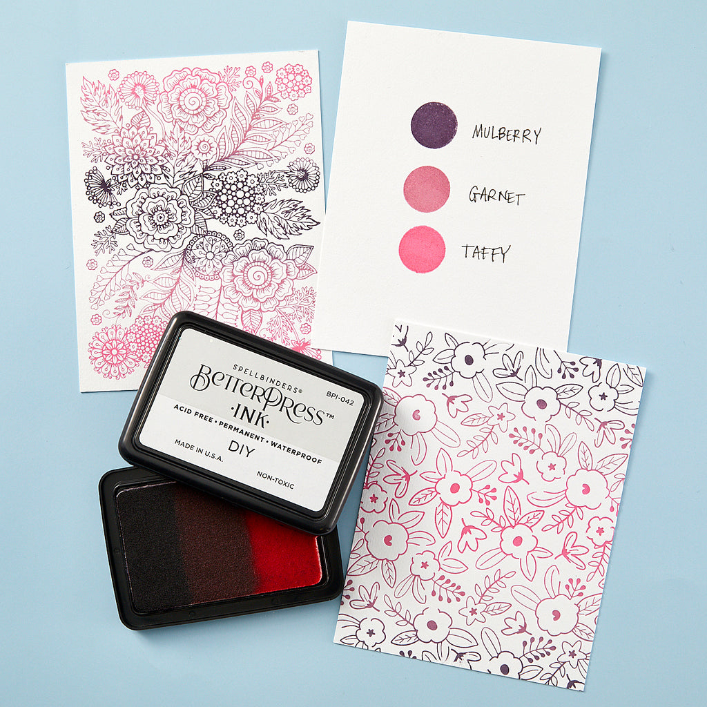 For an ombre effect, select one, two or even three coordinating BetterPress Reinker colors, and apply to the dry felt pad. Allow the ink to absorb into the ink pad and reink as needed. Index color by inking the top ink pad label with a brayer or blending tool. Conforms to ASTM D-4236. Made in the USA.