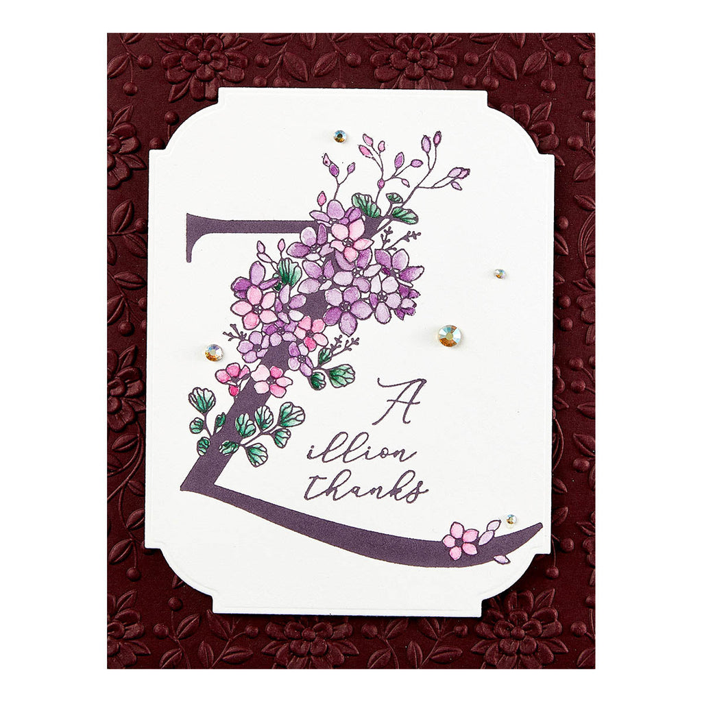 BetterPress Floral Alphabet on its own or use with the sentiment. Center the letter and sentiment on an A2-size (4.25 x 5.5-inch) card base for a lovely focal point design. Refer to images for placement recommendation.
