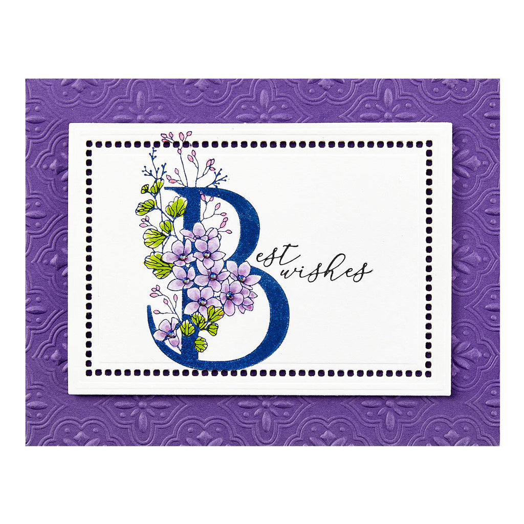 BetterPress Floral Alphabet on its own or use with the sentiment. Center the letter and sentiment on an A2-size (4.25 x 5.5-inch) card base for a lovely focal point design. Refer to images for placement recommendation.