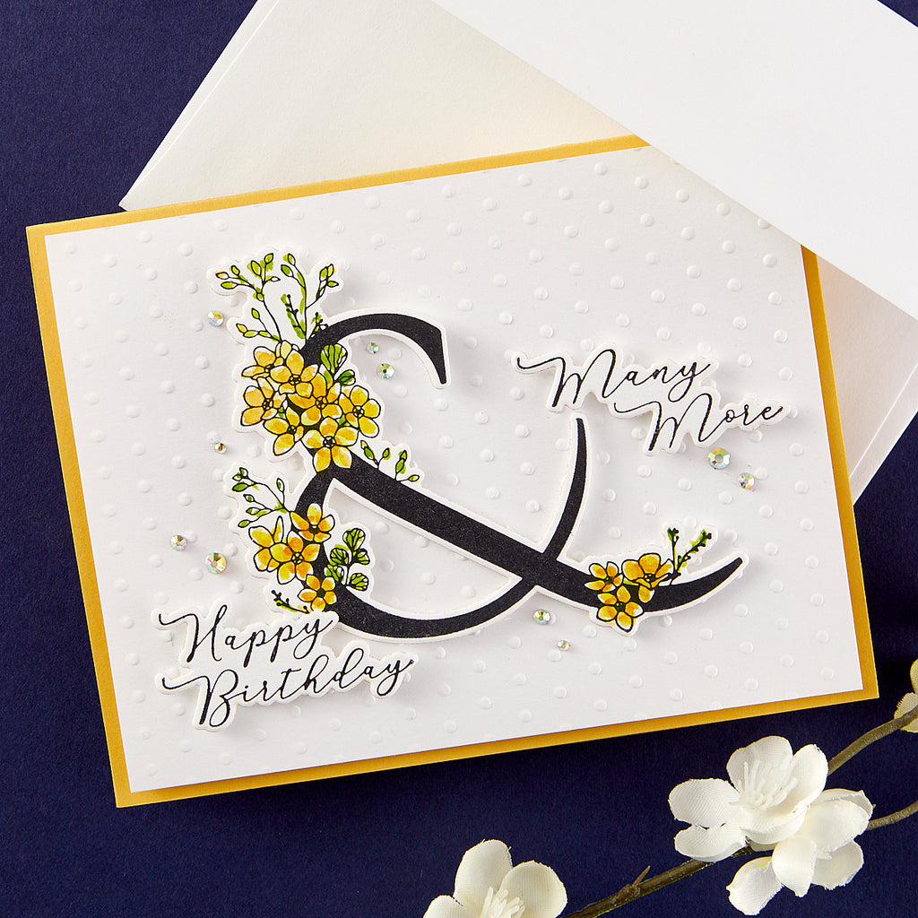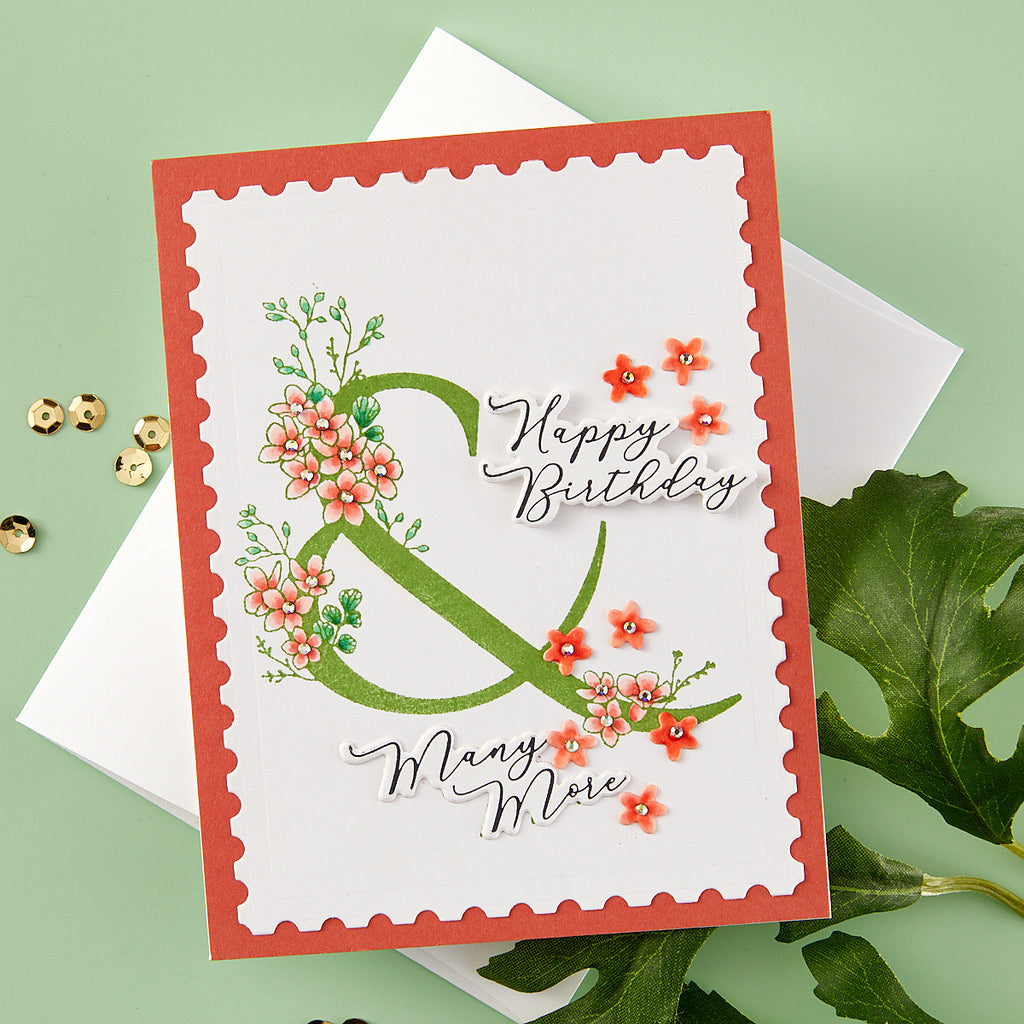 Floral & and Sentiment Press Plate & Die Set is part of the Every Occasion Floral Alphabet Collection and includes three press plates and matching three thin metal dies. Together they create a stunning birthday wish! The largest plate is the stunning contemporary symbol, &, accented with floral details, along with a matching die. The two other plates are sentiments, Happy Birthday and Many More, with matching dies. Ink the plates with the BetterPress Ink to be pressed against the BetterPress Cotton Card Panel and Sheets for a crisp letterpress design. Die-cut them and pop them up with foam or press into the card front…the choice is yours.