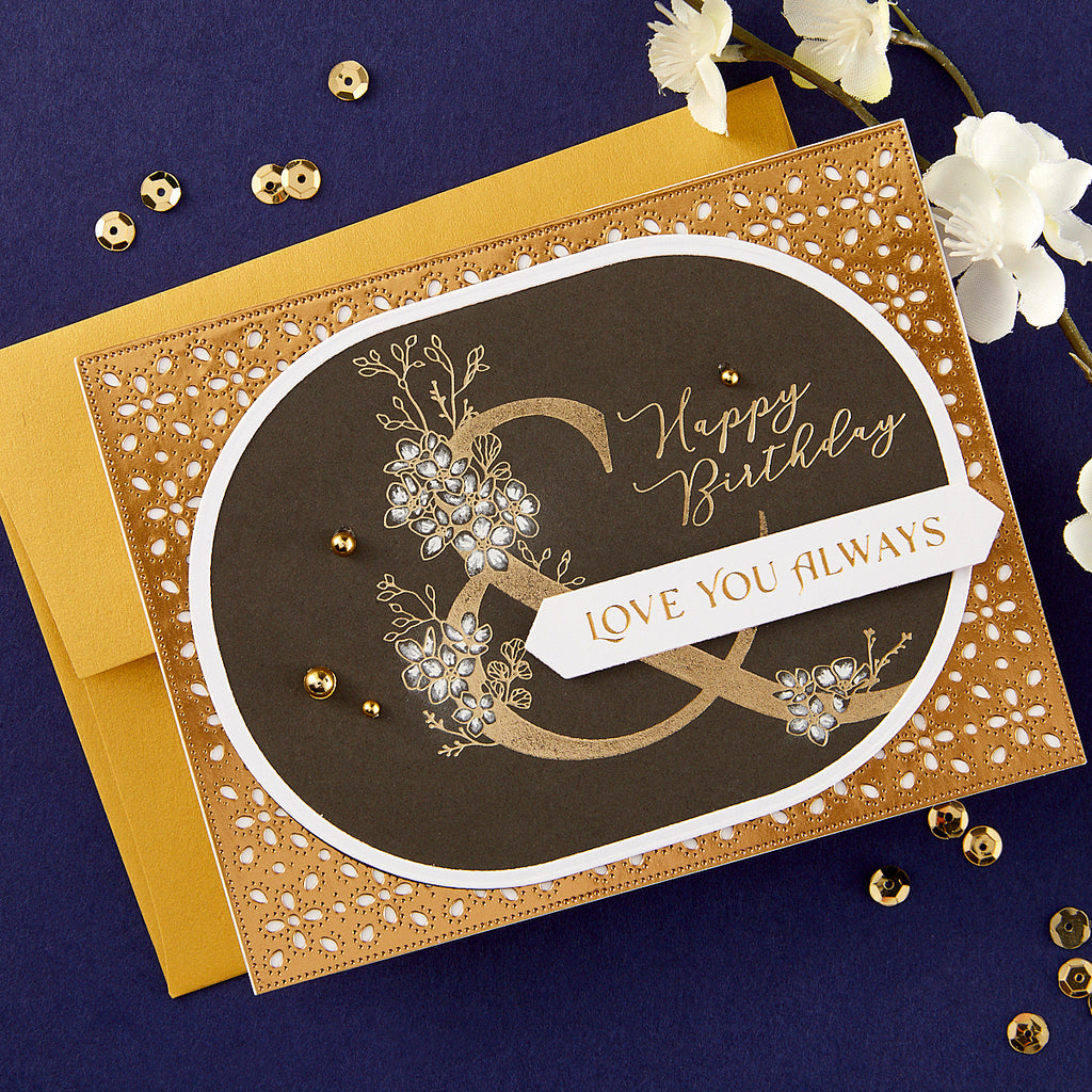 BetterPress Floral Alphabet on its own or use with the sentiment. Center the letter and sentiment on an A2-size (4.25 x 5.5-inch) card base for a lovely focal point design. Refer to images for placement recommendation.