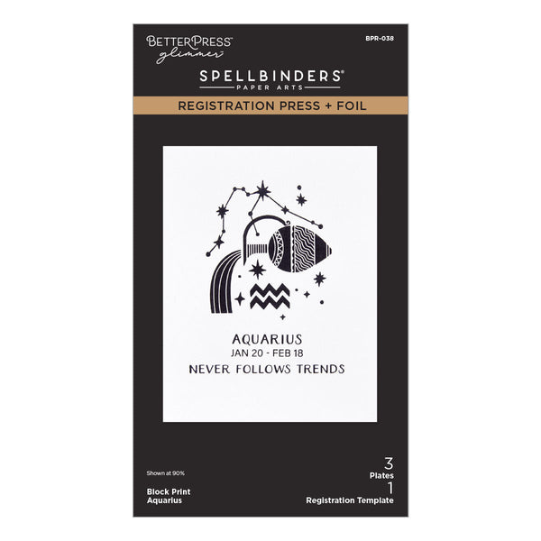 Block Print Aquarius Registration Press + Foil Plate is part of the Block Print Zodiacs Collection. The set of three Press + Foil plates and one acetate printed registration template come together to create a multi-color background and/or design placement of zodiac sign, Aquarius, its symbols, dates and traits. Note the acetate template is only for the BetterPress System and not for the Glimmer Hot Foil System which the heat will distort the acetate. The assembled Aquarius design measures 3.05 x 3.80 in./7.70 x 9.60 cm.