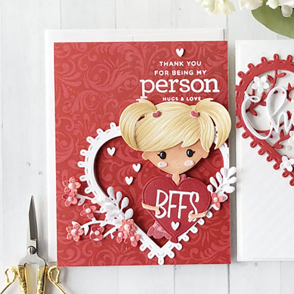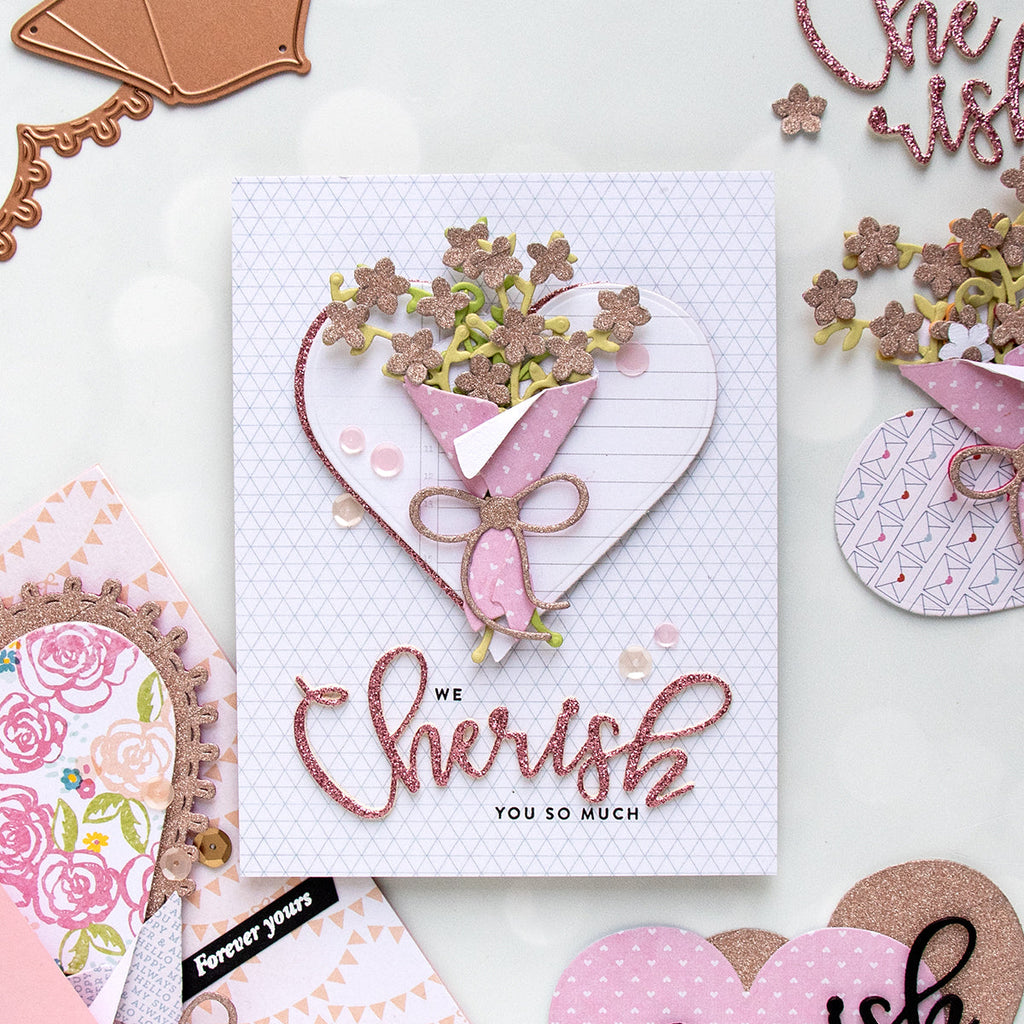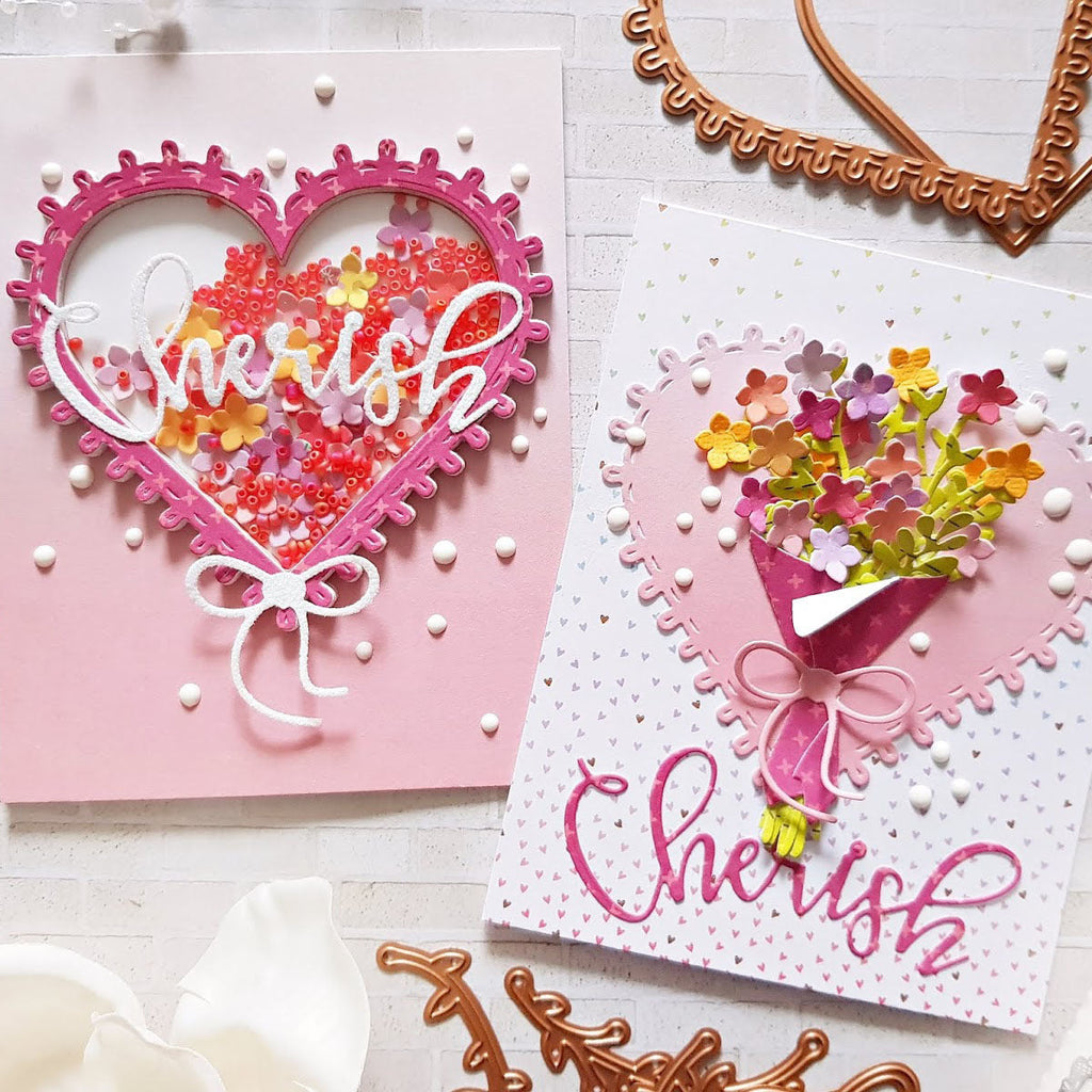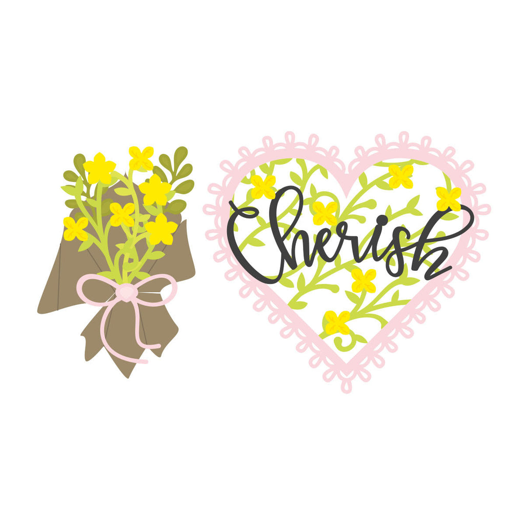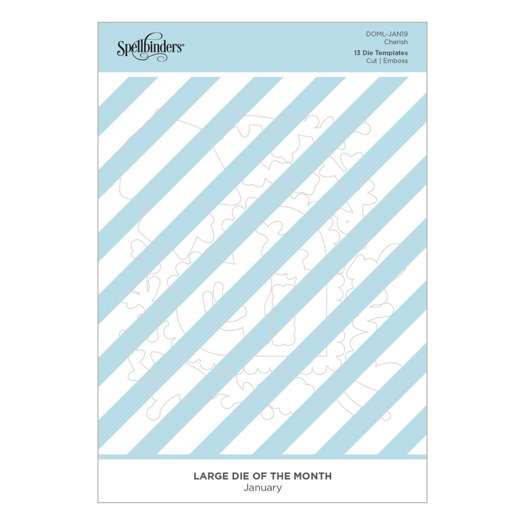 This 13 piece Cherish Die Set, cuts, embosses, debosses, and stencils. Released January 2019 to our NEW Large Die of the Month Club it became a favorite quickly. Perfect for Cards, Decor, gifts, and more!