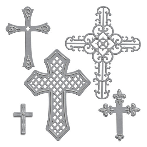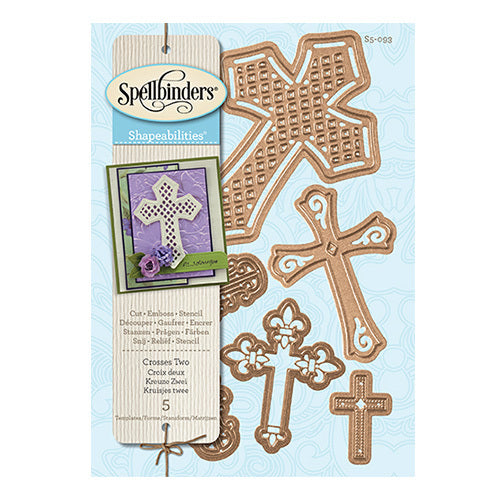 Crosses Two for your faith-based projects! This gorgeous set of five crosses includes a large lattice design, Celtic inspired, Fleur de Lis embellished, a dotted outline and a swirl designed cross. Use them separately, or stack them to make dimensional pieces. The five sizes and shapes are perfect for cards, scrapbook pages and home decor. Spellbinders® Shapeabilities® dies cut, emboss and stencil with a single die template.