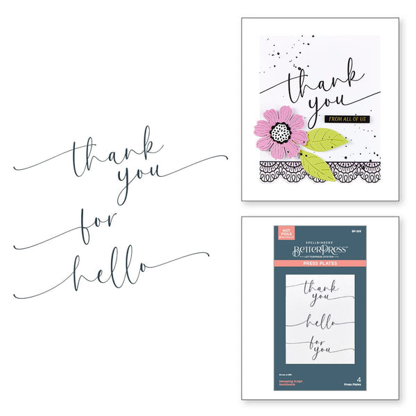 Sweeping Script Sentiments Press Plates are from the Vivid Expressions Collection. Add beautiful sweeping script font to your projects! The set of four plates includes thank, hello, for and you. Ink the plates with the BetterPress Ink to be pressed against the BetterPress Cotton Card Panel and Sheets for a crisp letterpress design.