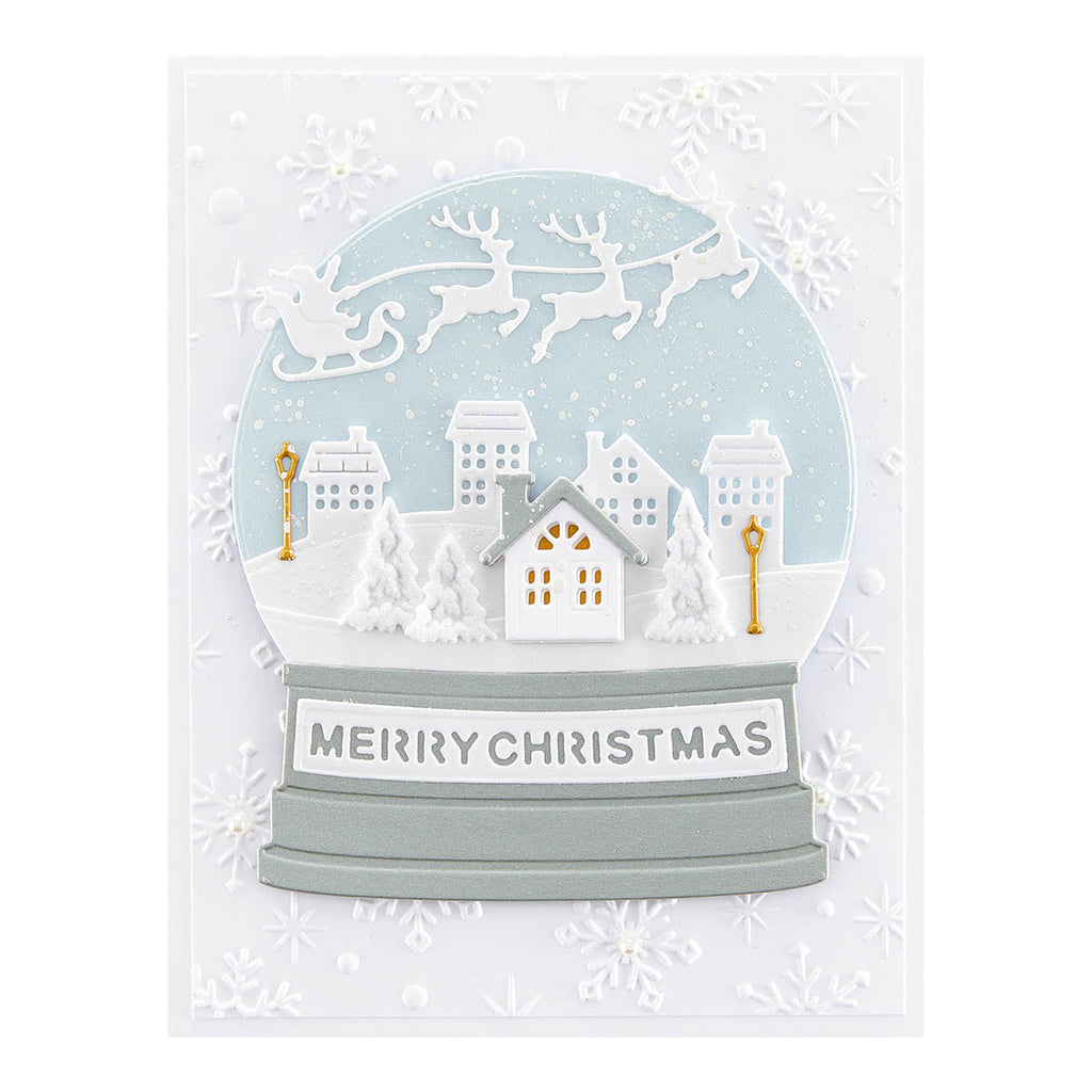 Simon’s Snow Globe Etched Dies are part of the Simon's Snow Globes Collection by Simon Hurley. In this set of 17 thin metal cutting dies, there are parts of the snow globe base that will be needed for the other scene sets in the collection (S4-1322 Woodland Scene Etched Dies, S4-1323 Nativity Scene Etched Dies, and S4-1324 Snowman Scene Etched Dies). Also in the set, there are a village, houses, evergreen trees, Santa with his sleigh and more! The four sentiments are Happy Holidays, Jingle Bells, Merry Christmas, and Merry & Bright.