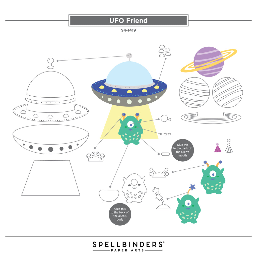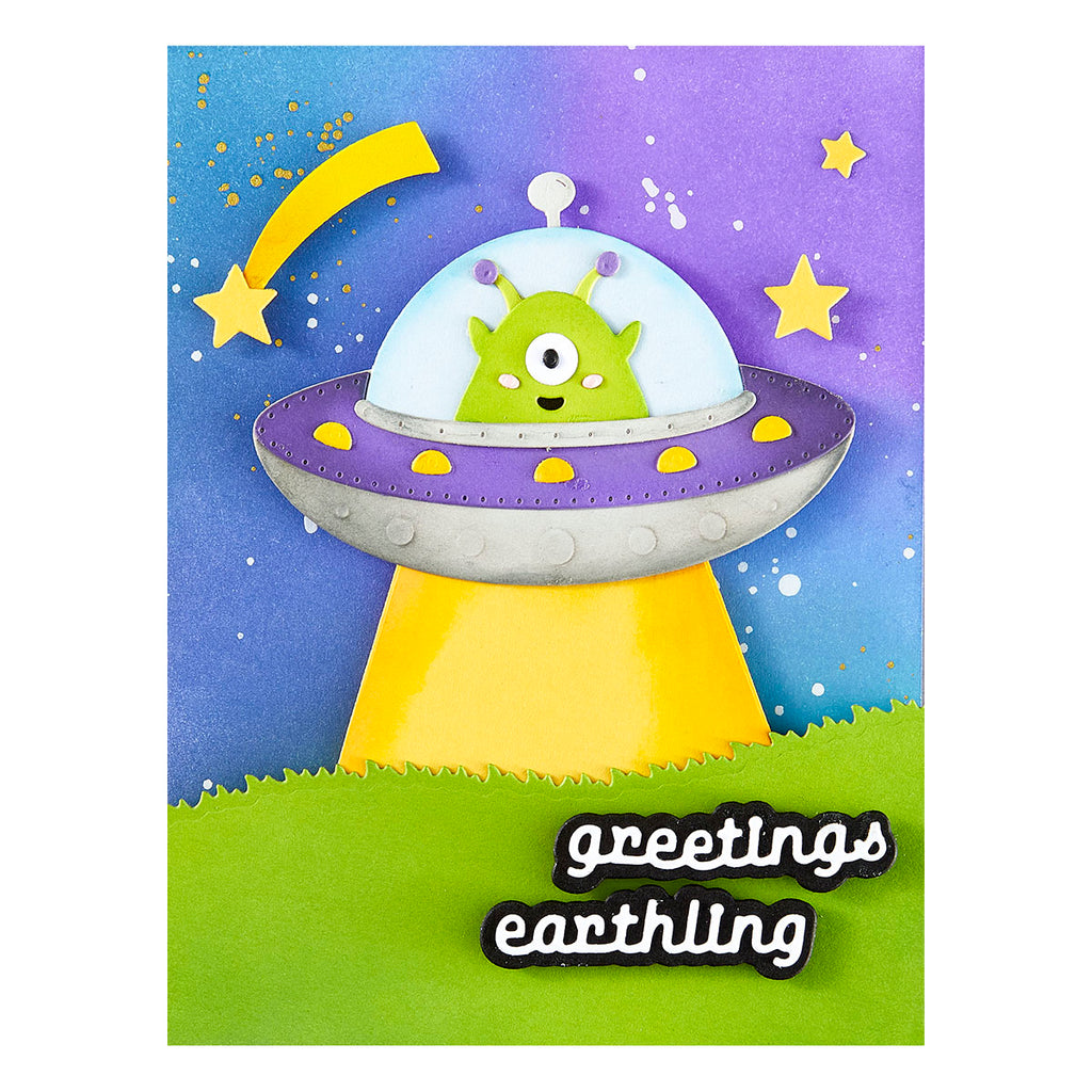 UFO Friend Etched Dies are part of the Space Adventure Collection by Simon Hurley. The set of 17 thin metal cutting dies assembled, makes a fabulous spaceship that includes an alien pilot with a beaming light to boot! The set also includes a planet with its rings and some accessories to accent your projects. Use them in any of your manual die-cutting machines. OR create on the go with the NEW PS-019 Simon Hurley – Platinum Scout Die Cutting & Embossing Machine 3.5” Platform!