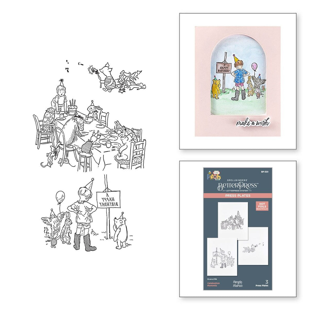 Celebration Moments Press Plates Celebrate birthdays with charm and nostalgia using the Celebration Moments Press Plates from the Say Cheese Classic Pooh Birthday Collection. This delightful set features three beautifully illustrated press plates starring Pooh and friends in heartwarming party scenes. Designed to capture the whimsy of the Hundred Acre Wood, these plates bring joyful storytelling to life on every handmade card or keepsake.
