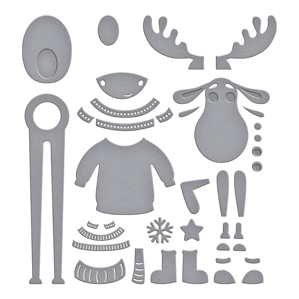 Dancin’ Moose Klondike Etched Dies is from the Dancin' Christmas Friends Collection with a set of 18 thin metal cutting dies. When assembled, it creates this fun moose with moving legs that swing back and forth. He is one tall moose measuring almost 6 inches tall! There are other fun accessories in the set to complete his outfit.