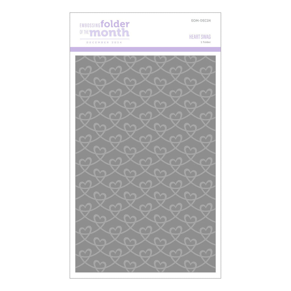 Heart Swag Embossing Folder of the Month released December 2024 to our Embossing Folder of the Month Club. This large embossing folder can make slimline, 5″ x 7″, and a variety of sized projects. Perfect for adding texture and dimension to your card projects.
