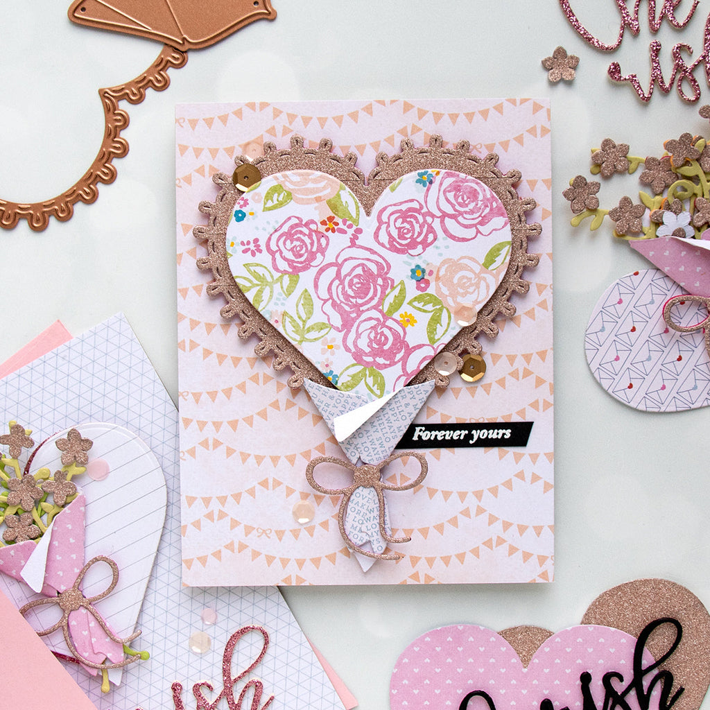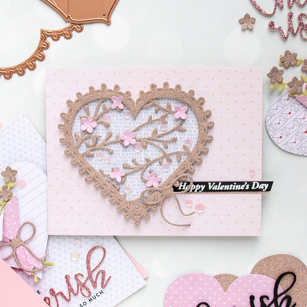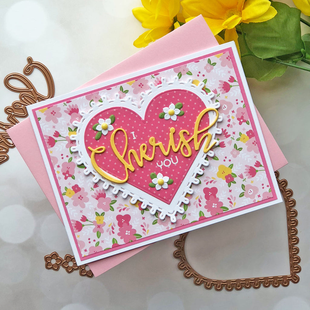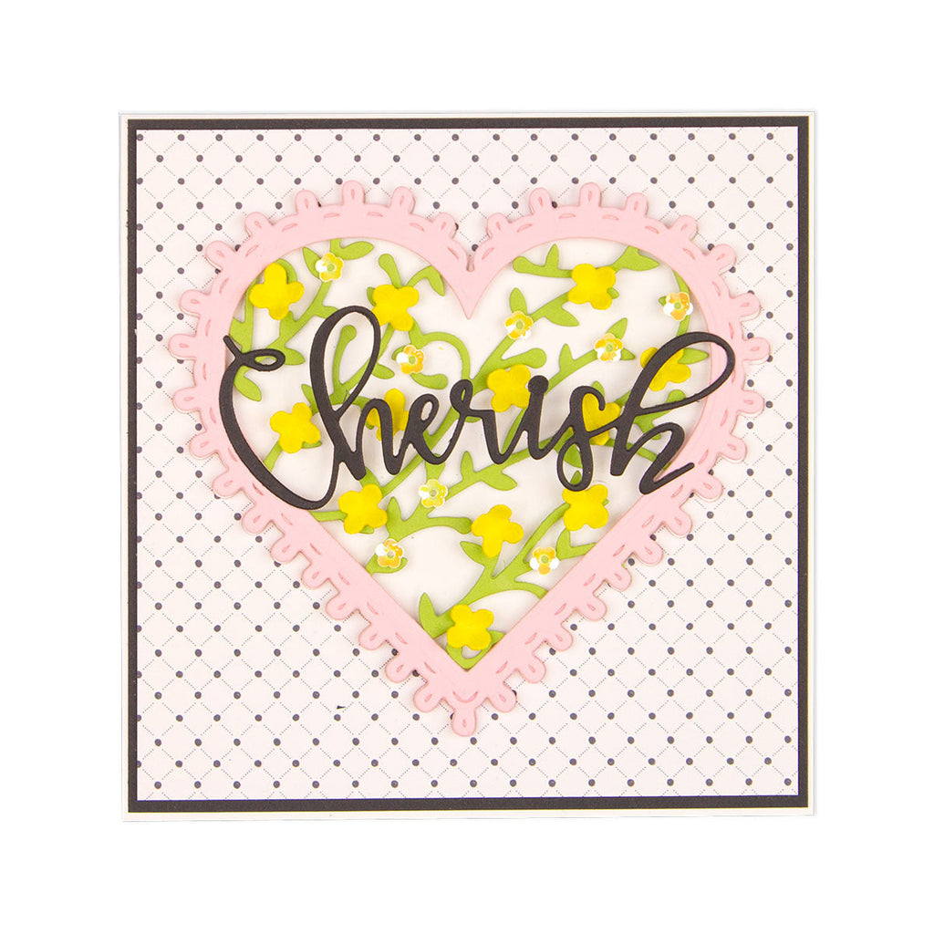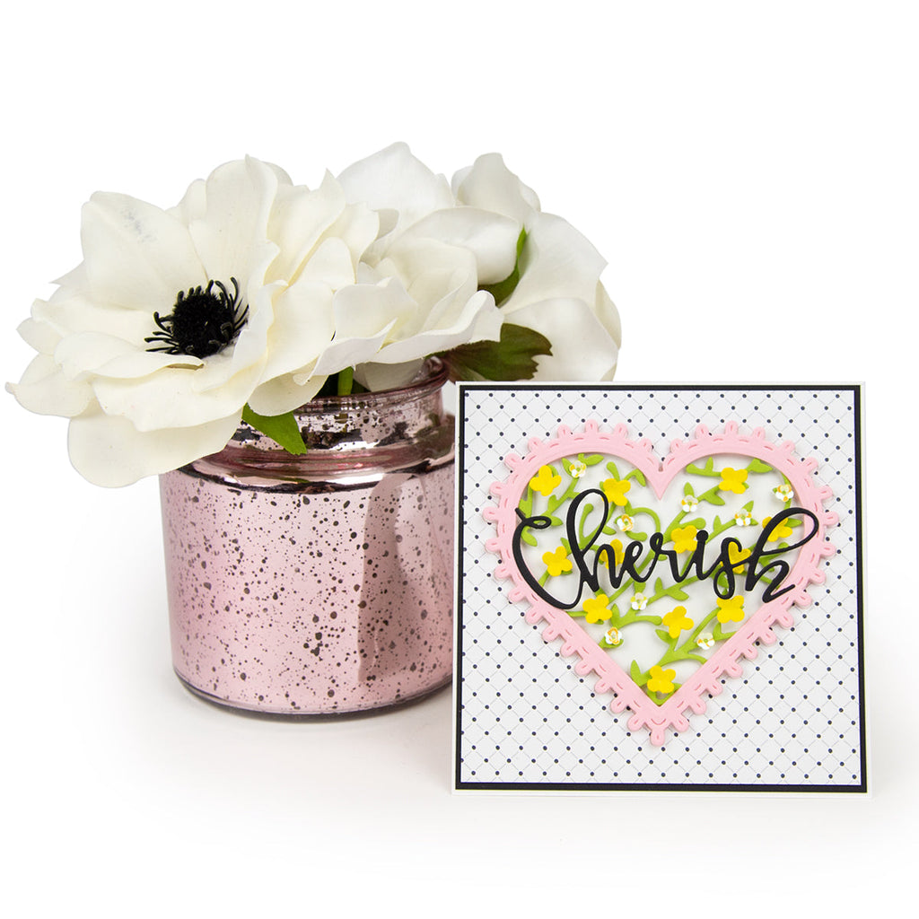 This 13 piece Cherish Die Set, cuts, embosses, debosses, and stencils. Released January 2019 to our NEW Large Die of the Month Club it became a favorite quickly. Perfect for Cards, Decor, gifts, and more!