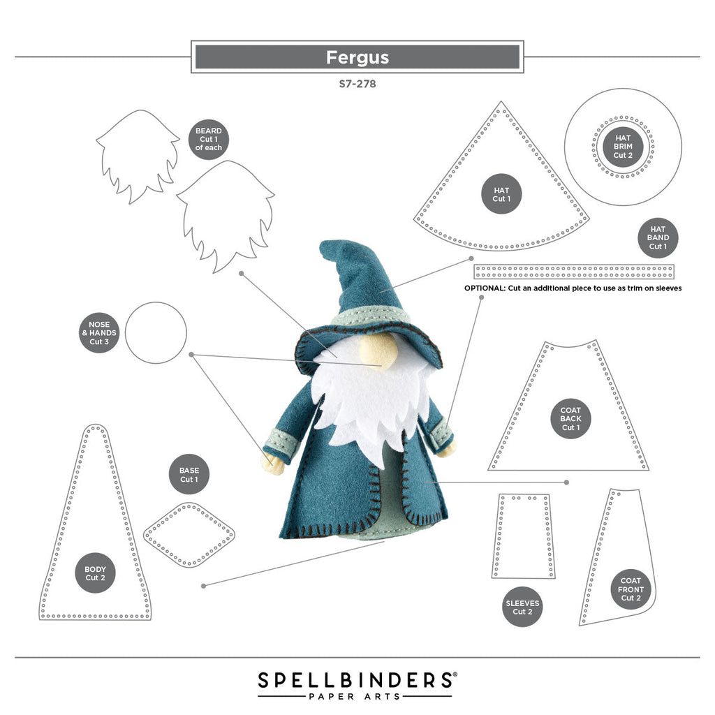 Fergus 3D Felt Décor Die Collection Bundle includes all the dies from this collection by Sandi MacIver. They are S7-278 Fergus, S4-1490 Autumn & Halloween Embellishments, and S4-1491 Winter & Christmas Embellishments. Together, this bundle can create Fergus, the gnome, ready for the fall and winter seasons