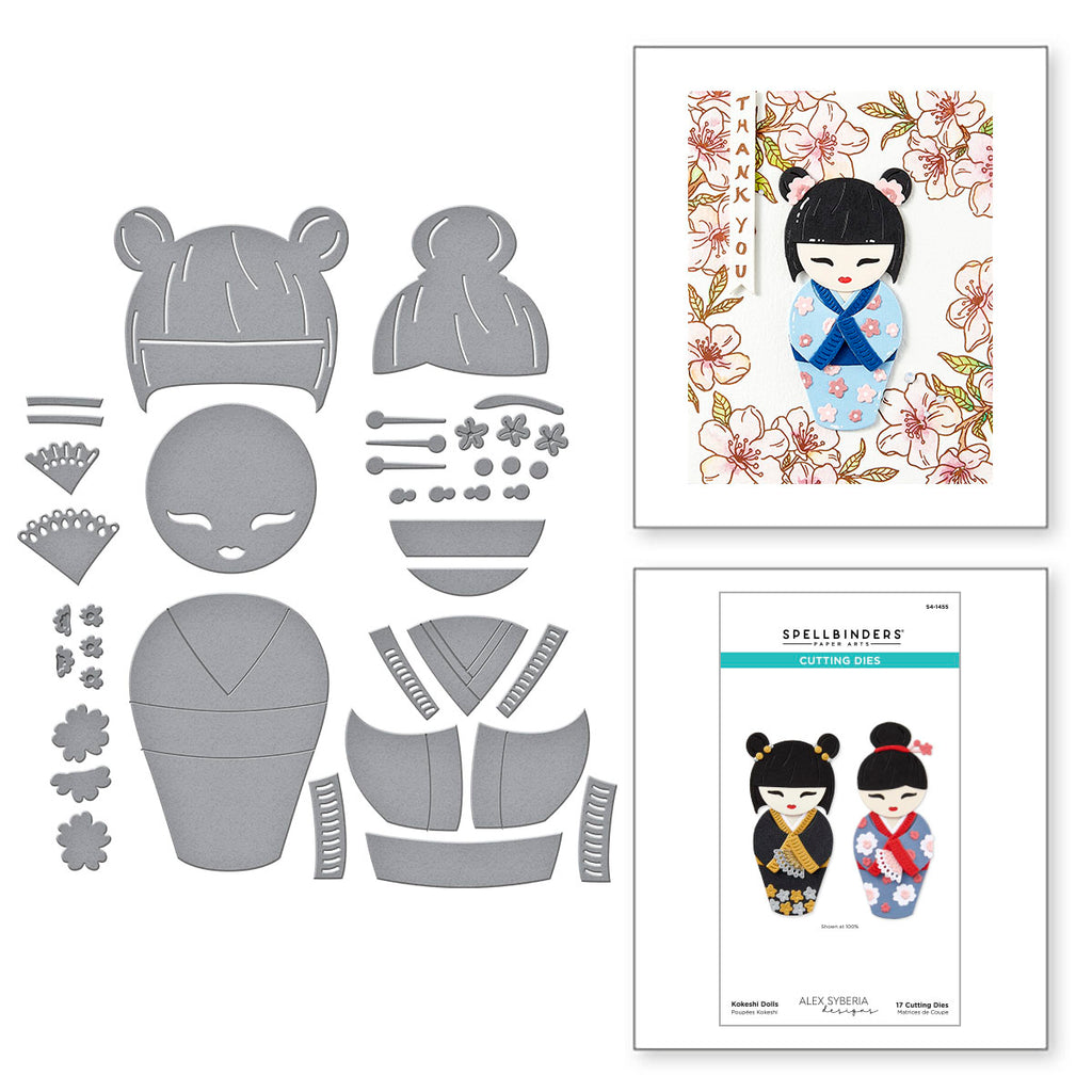 Kokeshi Dolls Etched Dies are from the Spring in Kyoto Collection by Alex Syberia Designs. Assembled, this set of 17 thin metal cutting dies make two designs of a wooden Kokeshi Doll. One has a single bun hair style and another has double buns. Accessories include a fan, flowers and a variety of hair décor for lots of ways to personalize the doll.