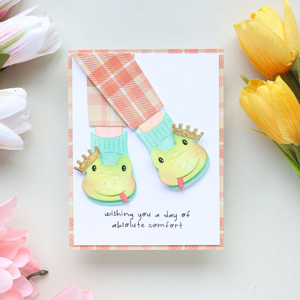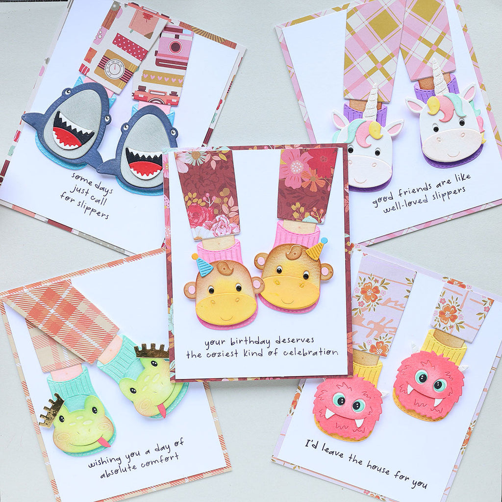 From Santa and his reindeer to whimsical unicorns, cows, and sharks, these adorable slipper friends are ready for every season and every smile. Pair them with the coordinating Cozy Toes Friends clear stamp set for sweet, witty sentiments that match their charm. Whether youre crafting cards, tags, or gift wraps, this bundle is pure comfort and creativity rolled into one irresistible package.
