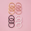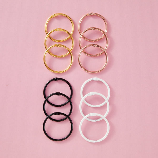 Includes twelve rings, three each in colors of gold, rose gold, black and white.