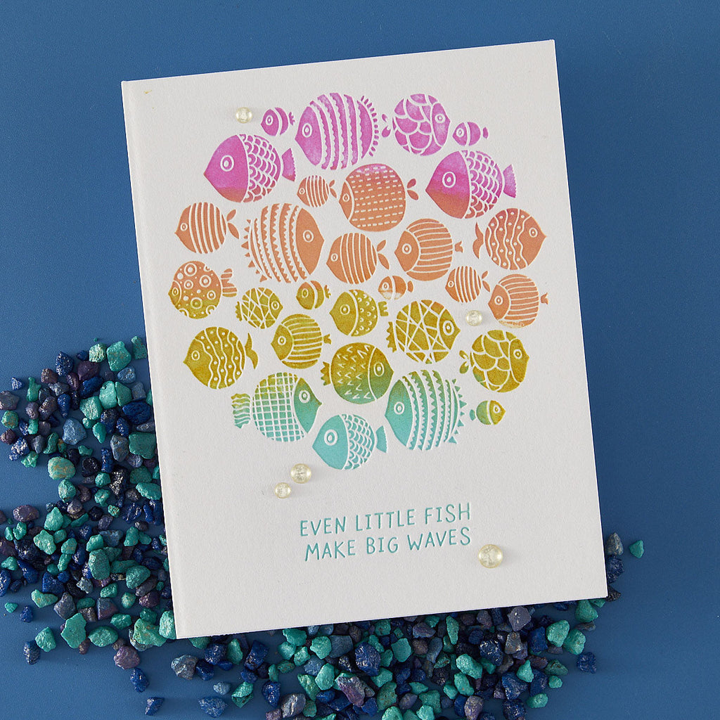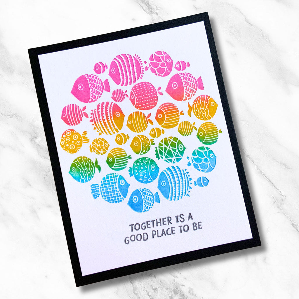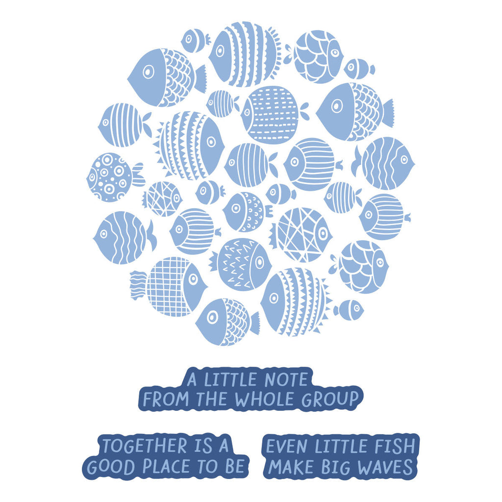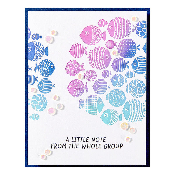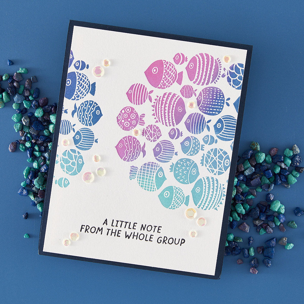 The set includes a detailed fish cluster plate along with three coordinating sentiments: “A little note from the whole group,” “Together is a good place to be,” and “Even little fish make big waves.” Mix and match sentiments to fit any occasion, and experiment with inks, blends, and embellishments to bring your underwater scene to life. A versatile design that’s as fun to create with as it is to send!