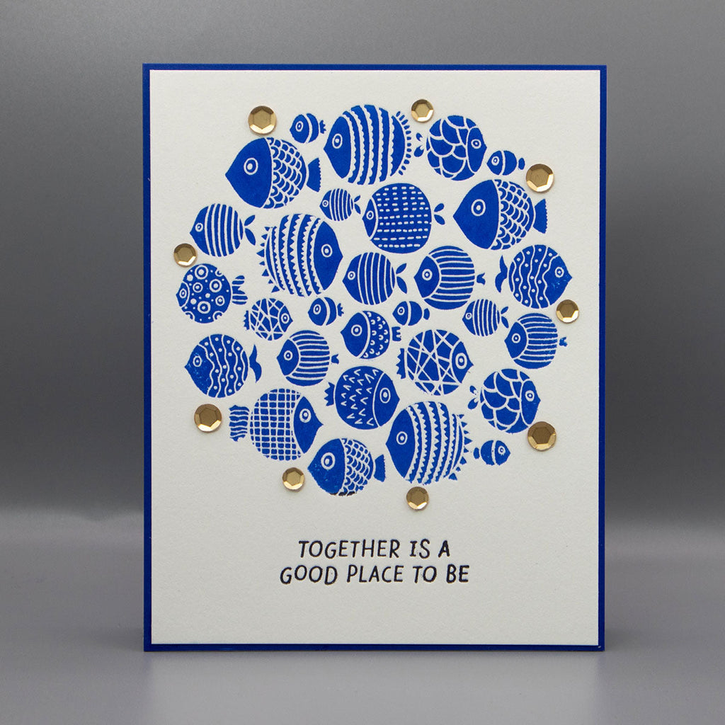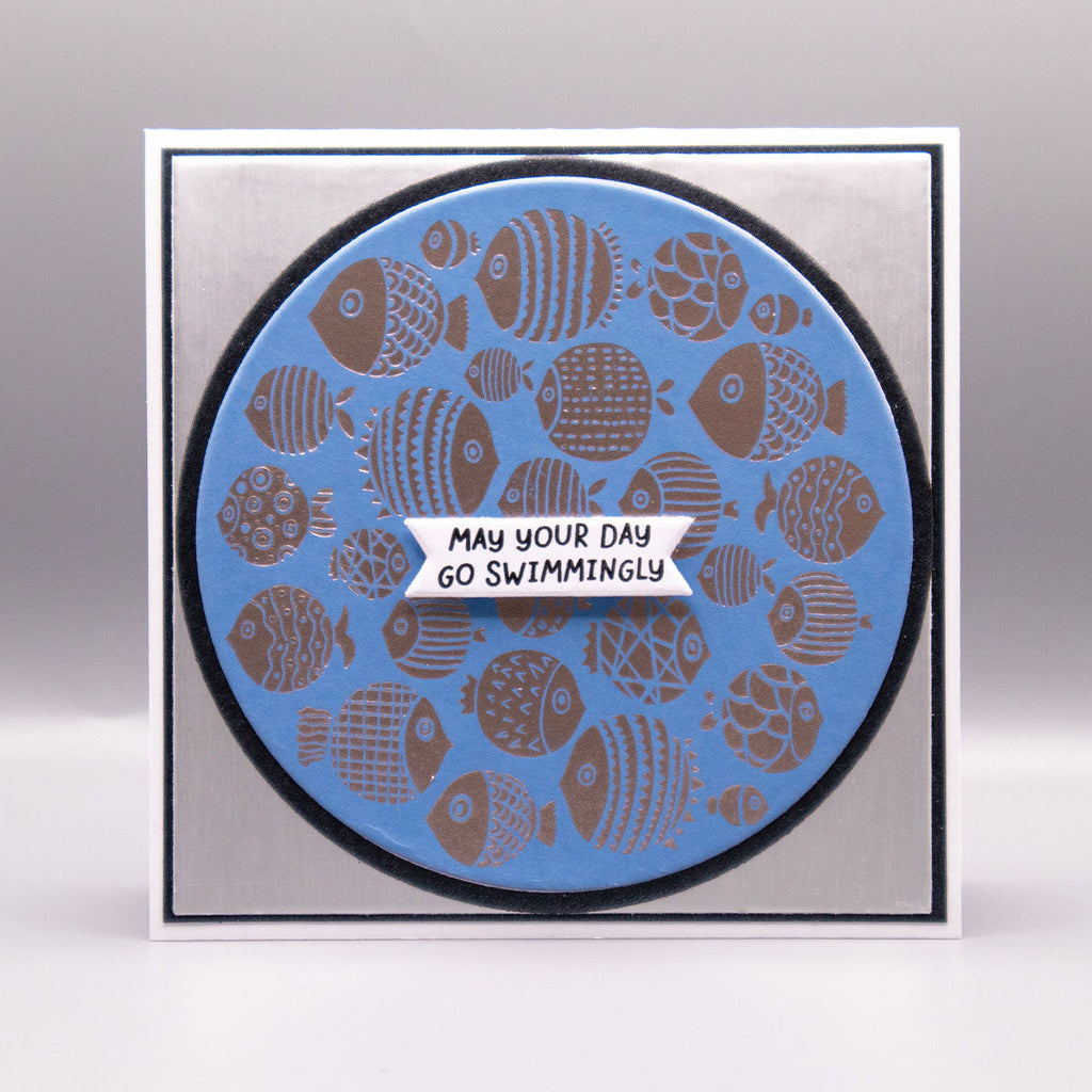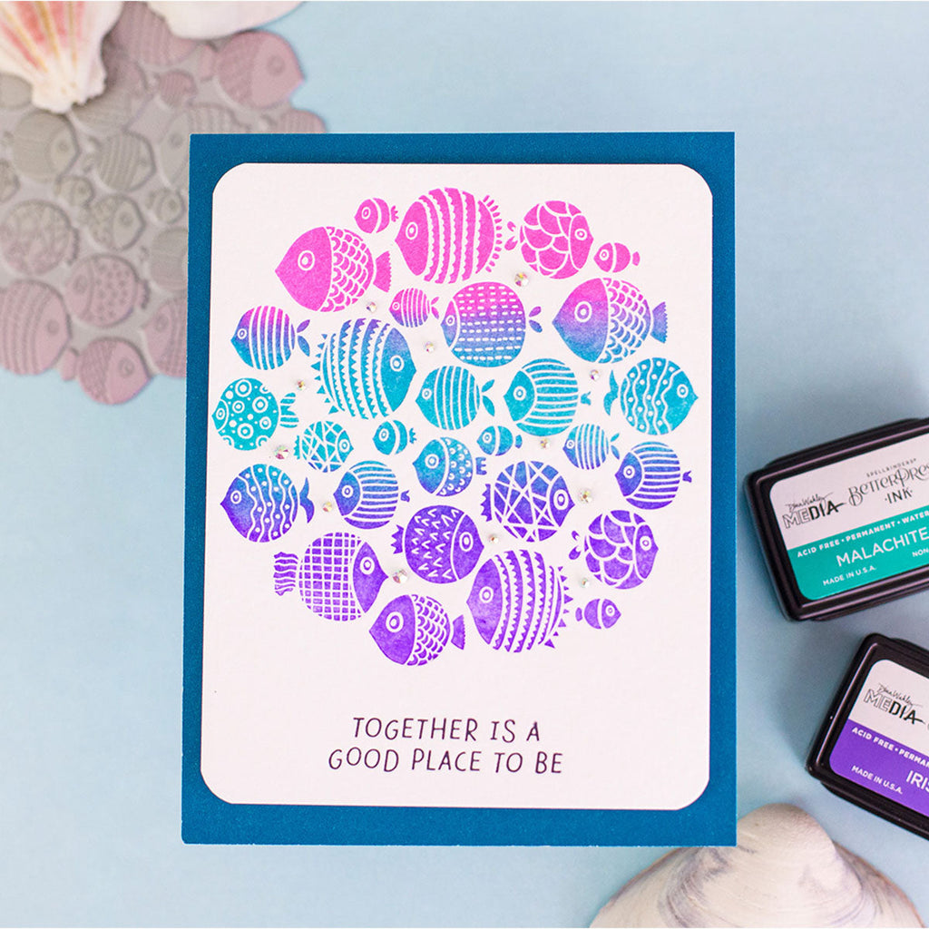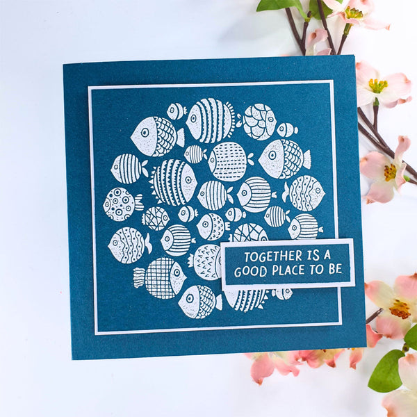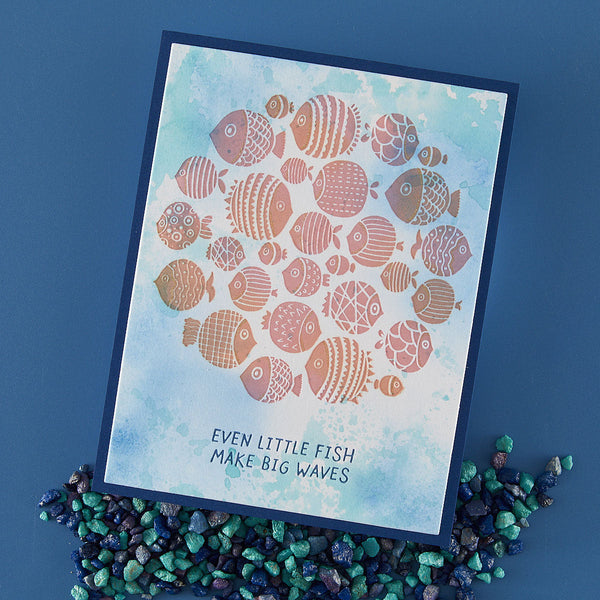 The set includes a detailed fish cluster plate along with three coordinating sentiments: “A little note from the whole group,” “Together is a good place to be,” and “Even little fish make big waves.” Mix and match sentiments to fit any occasion, and experiment with inks, blends, and embellishments to bring your underwater scene to life. A versatile design that’s as fun to create with as it is to send!
