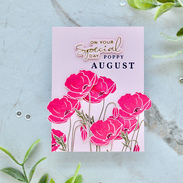 August Poppy Press Plates are from the Florals Through the Year Collection. August is celebrated with the poppy as its birth flower, embodying the month's themes of strength and remembrance. The set of three plates includes the floral focal point, the birth flower month, and flower name. This lovely flower is ideal for celebrating August birthdays, but is versatile enough to be used in a myriad of ways! Create a field of flowers with several of the plates from this collection, or make this flower a focal point with a sentiment of your choice.