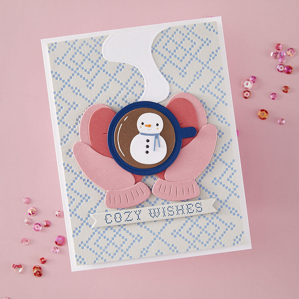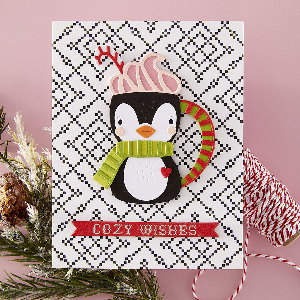 The set includes two stitched-style sentiments, Cozy Wishes and Holiday Cheer, designed in a charming banner format for a polished finish. Perfect for pairing with die-cut characters or layered elements, this plate adds the look of hand-stitched warmth to cards, tags, and beyond.