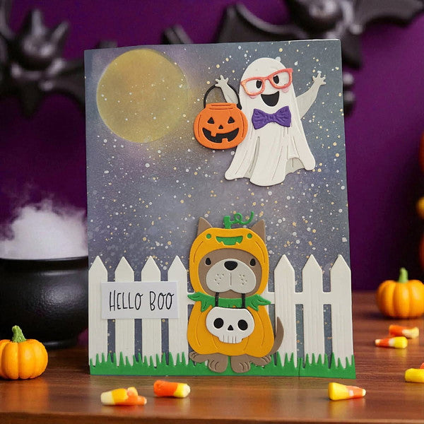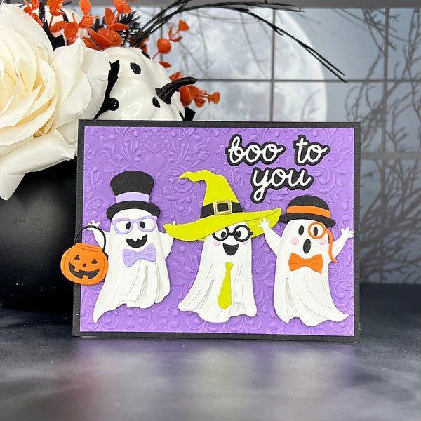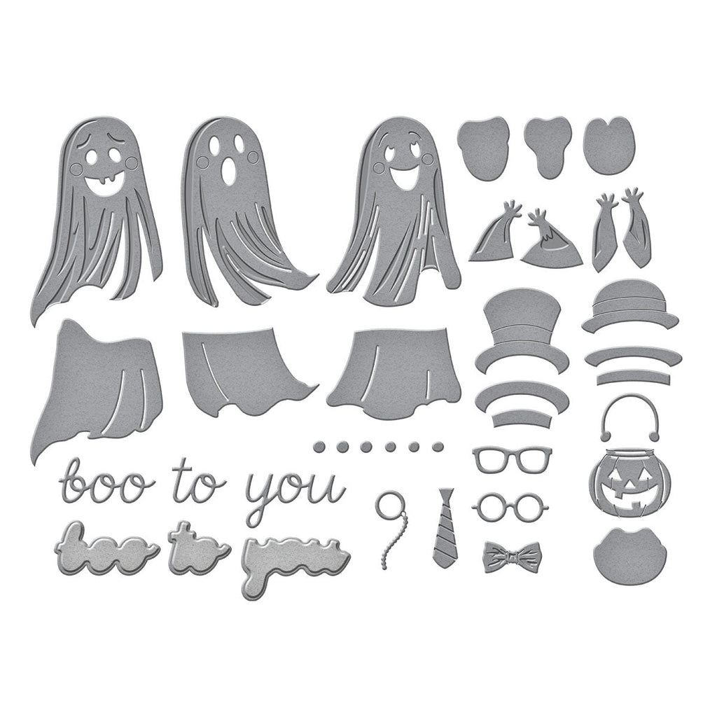 Boo Crew Etched Dies are from the Spooktacular Collection by Simon Hurley. Make a grouping of friendly ghosts with this set of 24 thin metal cutting dies! There are several kinds of spooks to create, and each can have a personality with the elements in the set from a toothy smile, one with glasses, one with a top hat