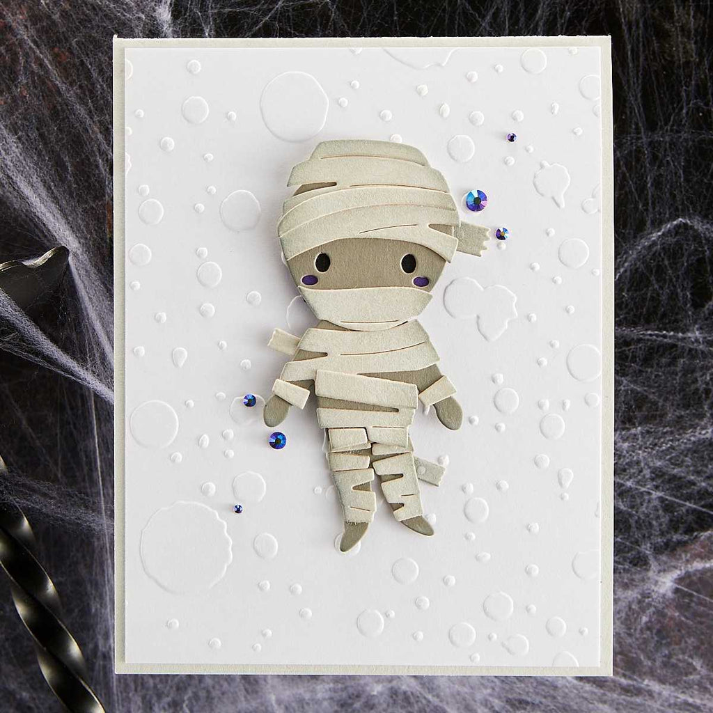 The Dancin' Mummy Etched Dies is from the Boo Dance Party Collection and has a set of seven thin metal cutting dies to create a super cute mummy. But wait, there’s more - it’s interactive with its moving legs! Wrap him up and take him home. The assembled Dancin' Mummy measures 2.04 x 3.19 in./5.20 x 8.10 cm. If the mummy needs a dance partner, look to S3-465 Dancin’Ghost set!