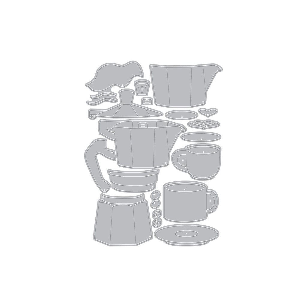 Stovetop Espresso Etched Dies from the What's Brewing? Collection is sure to give you a caffeine buzz! This set of 18 etched dies comes together to build a classic stovetop coffee pot, as well as two mugs for enjoying your brew. Each mug has sweet latte art and inviting steam, plus a few loose coffee beans for extra fun. This detailed set will perk you right up!