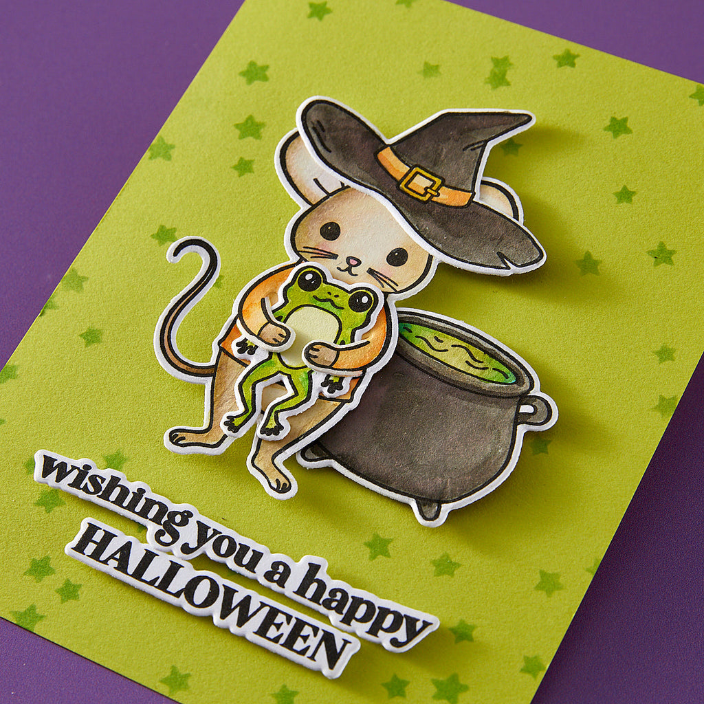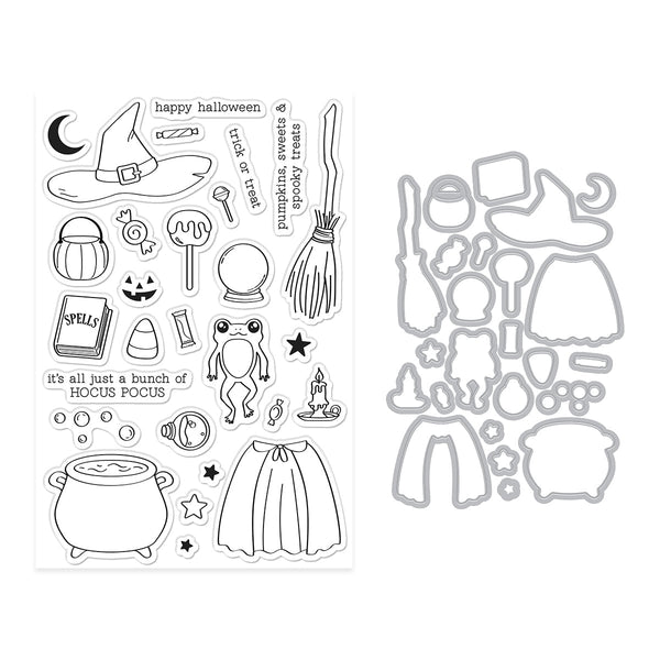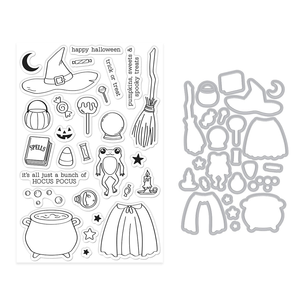 Brew up some creative fun with the Tricks and Treats Stamp & Cut Set! This enchanting collection is packed with whimsical Halloween imagery—a witch hat, bubbling cauldron, spell book, candy, frog, and even a witch's cape and broom! Sentiments like “Happy Halloween,” “Trick or Treat,” and “It’s all just a bunch of Hocus Pocus” make this set perfect for spooky cards, treat toppers, and party décor.