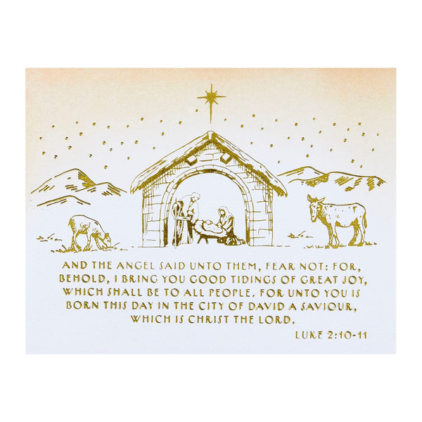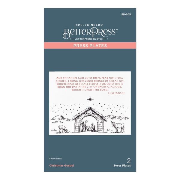 Christmas Gospel Press Plates are from the Home for the Holidays Collection. This stunning set of two press plates welcomes the arrival of Jesus. One plate is a beautiful nativity scene, and the other is the Bible verse: Luke 2:10 – 11. Use them together or separately. Ink the plates with the BetterPress Ink to be pressed against the BetterPress Cotton Card Panel and Sheets for a crisp letterpress design.
