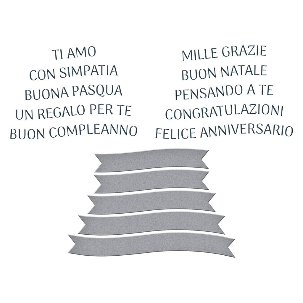 Italian Sentiments BetterPress Plate & Die Set is from the International Sentiments Collection. Each of the two plates press five Italian sentiments at once, perfect for cutting out with the matching thin metal cutting die for a time-saving step. The sentiment strips are cut into waving ribbon-tail ends on both sides to create movement. There’s a total of 10 sentiments to choose from. The uppercase font sentiments cover many occasions such as Grazie/Thank You, Natale/Christmas, Pensando/Thinking, Congratulazioni/Congratulations, Anniversario/Anniversary, Ti Amo/I love You, Simpatia/Sympathy, Pasqua/Easter, Regalo/Gift and Compleanno/Birthday. Ink the plates with the BetterPress Ink to be pressed against the BetterPress Cotton Card Panel and Sheets for a crisp letterpress design.
