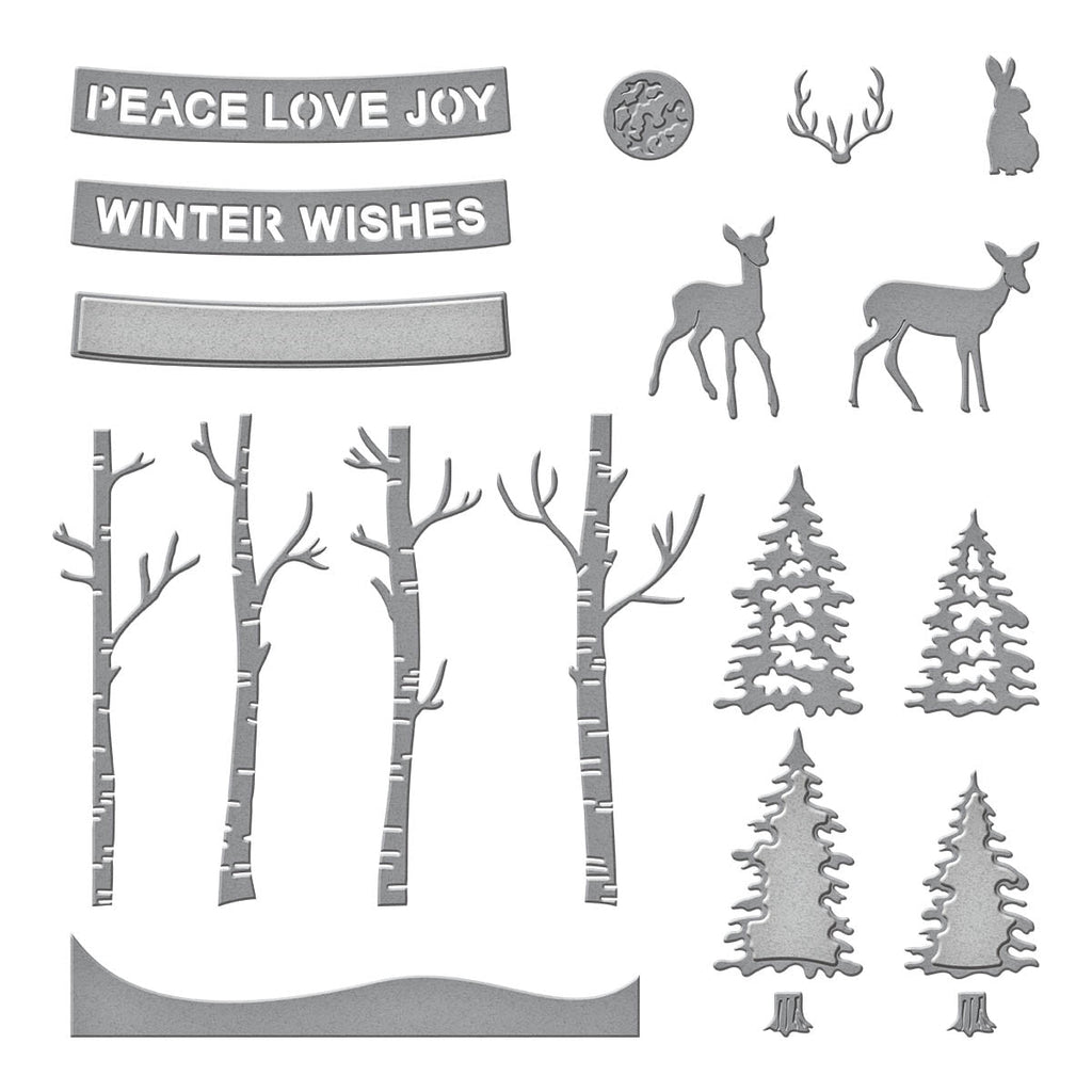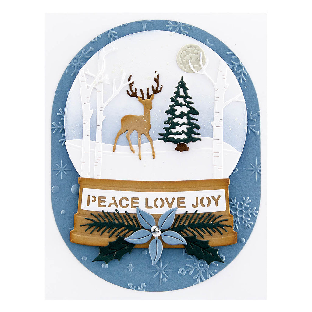 Woodland Scene Etched Dies are part of the Simon's Snow Globes Collection by Simon Hurley. Designed to work with S6-222 Simon's Snow Globe Etched Dies, this set of 15 thin metal cutting dies adds a woodland scene to the ensemble. It includes tall Birch Trees, deer, evergreen trees and more. There are two sentiments in the set, Winter Wishes and Peace Love Joy. Mix and match with other scene sets in the collection!