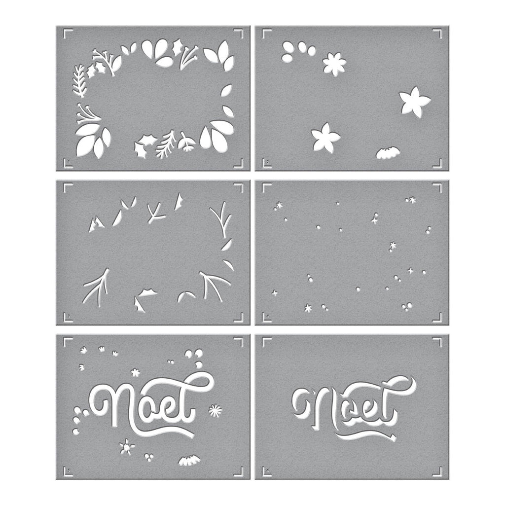 These Layered Noel Foliage Stencils are made of durable mylar stencil material. The four stencil sheets create a sweet burst of holiday florals and branches framed around the Noel sentiment. Also available with the coordinating die in BD-0777 Layered Noel Foliage Stencil & Die Bundle.