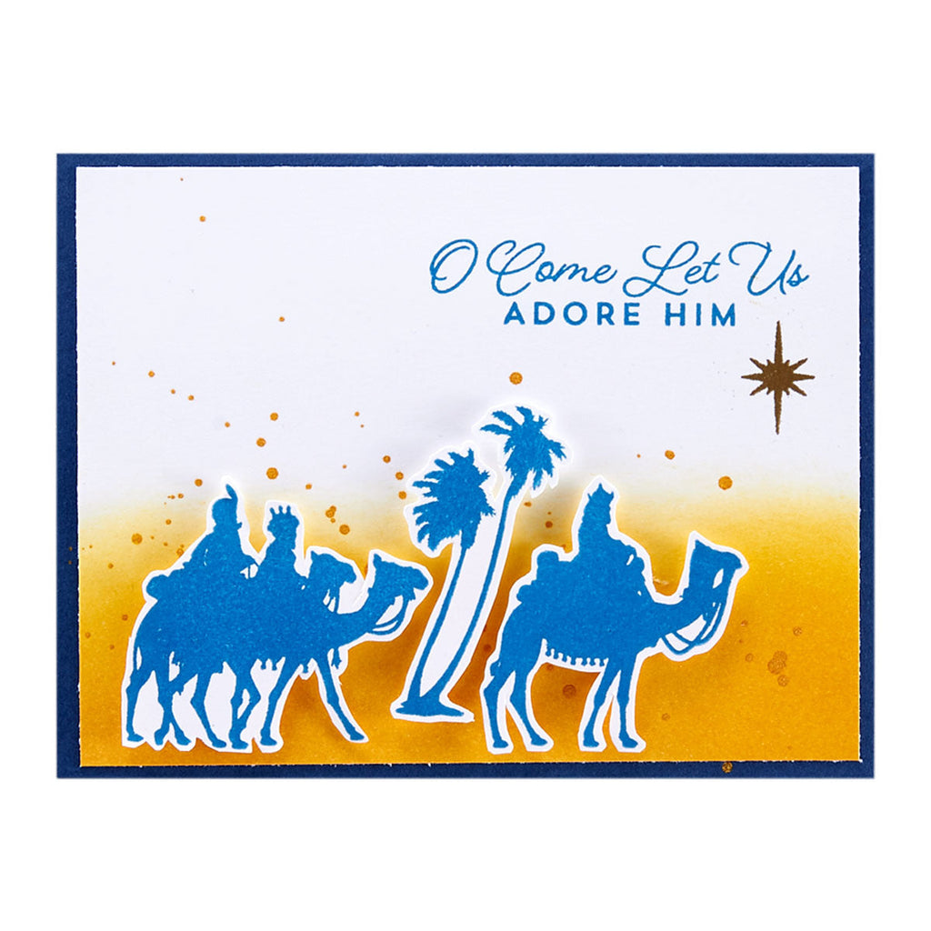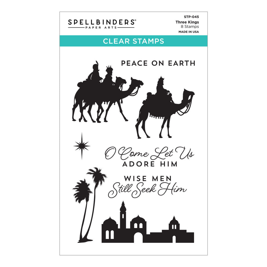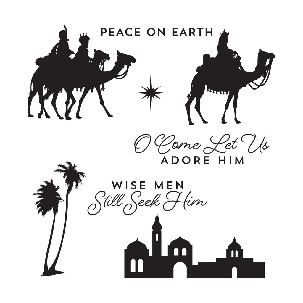 Three Kings Clear Stamp Set is part of the Christmas Traditions Collection. The set of eight clear polymer stamps includes two king riding camel silhouettes, one each of a village scene, palm trees, a shiny star, and three sentiments. A wonderful set to share the true meaning of Christmas.