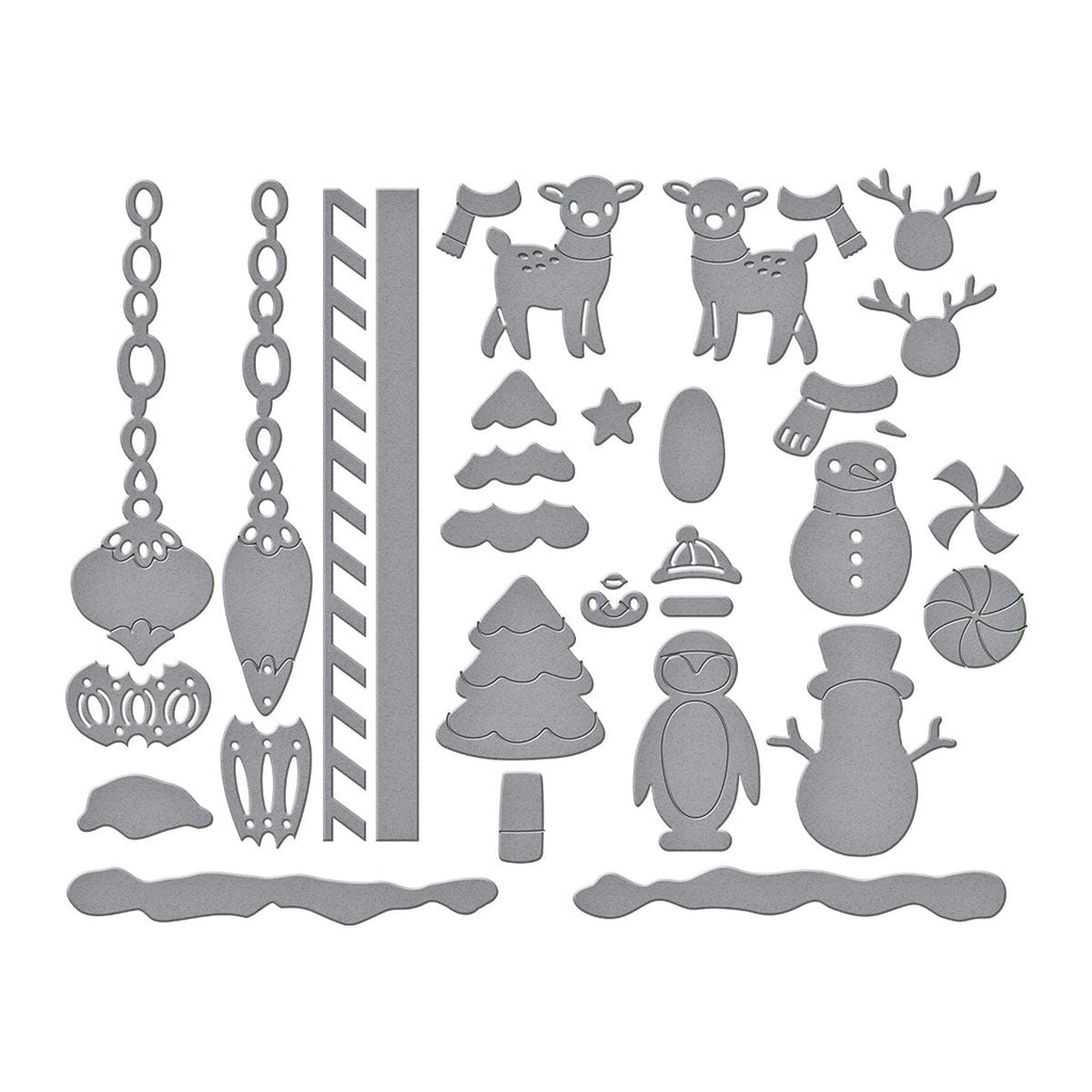 Chiming Christmas Etched Dies are from the Cuckoo Cottage Collection. This set of 17 thin metal cutting dies has lots of adorable Christmas-themed elements to accent on projects. But it works with and perfectly adorns S5-701 Cuckoo Cottage set.