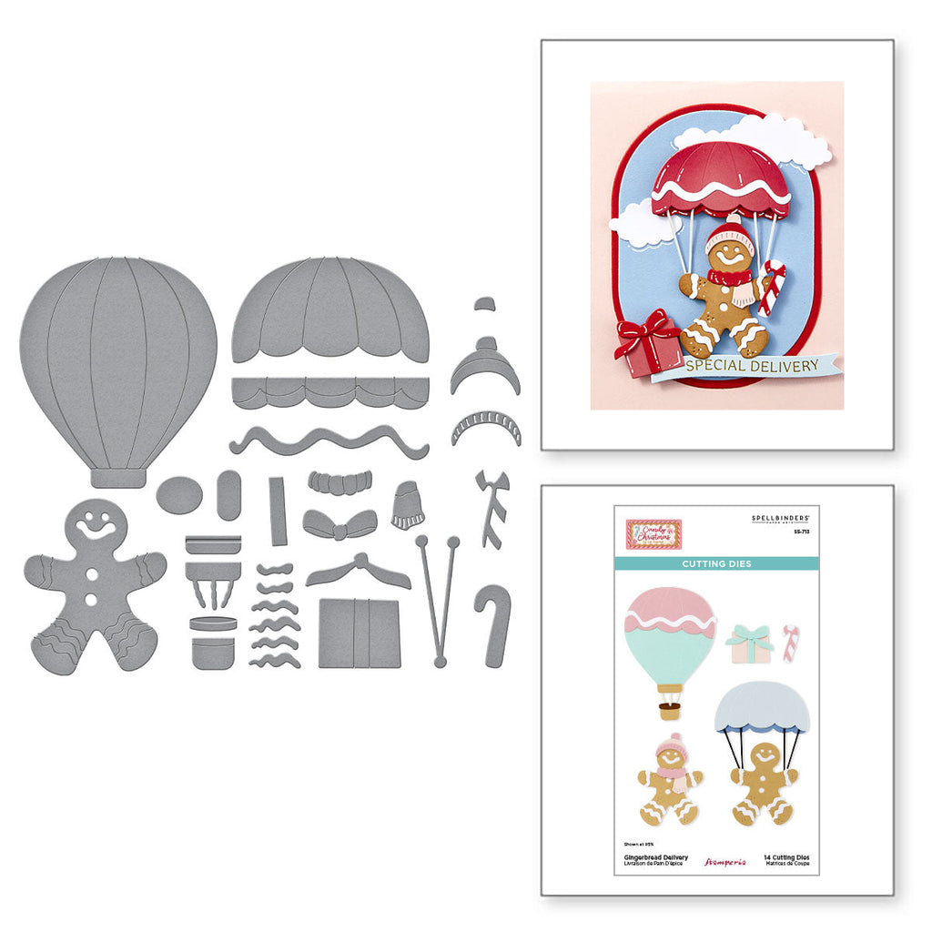 Gingerbread Delivery Etched Dies by Stamperia is a set of 14 thin metal dies that create a sweet friend dropping in to say hello! This versatile set offers lots of options for bringing a special gift. Create a fun hot air balloon or go for a gingerbread man with a parachute, the choice is yours! There are also lots of accessories, including a candy cane, a gift, and winter gear for your cookie friend. What a fun and playful way to deliver some holiday cheer.