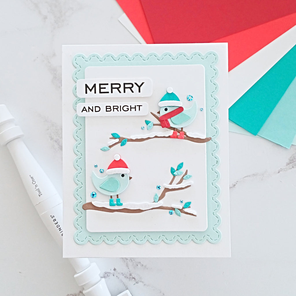 Little Birdies Etched Dies are from the All About Christmas Collection by Lisa Horton. Assembled, this set of 13 thin metal cutting dies creates two sweet little birds! Give them personality by adding a hat, scarf, earmuff and more. Also, in the set are branches, perch and even add snow on them. So cute!