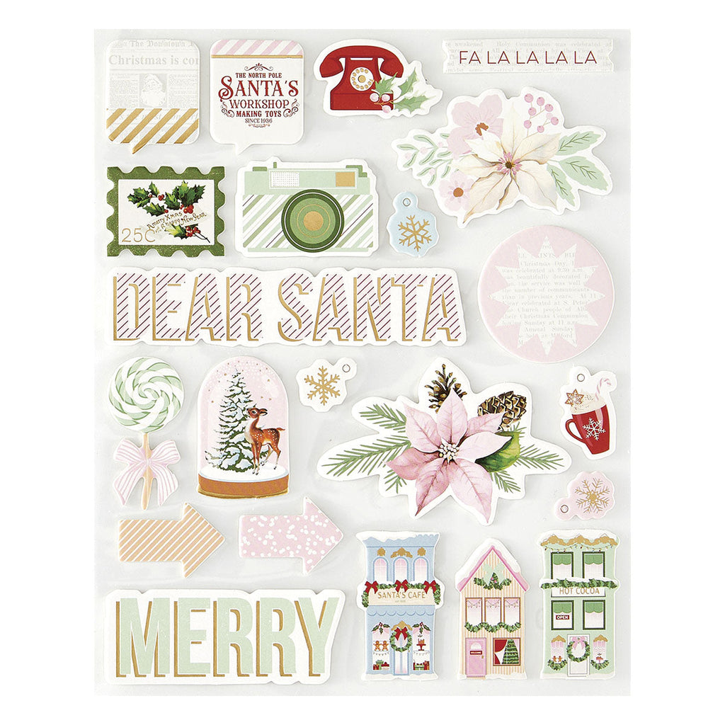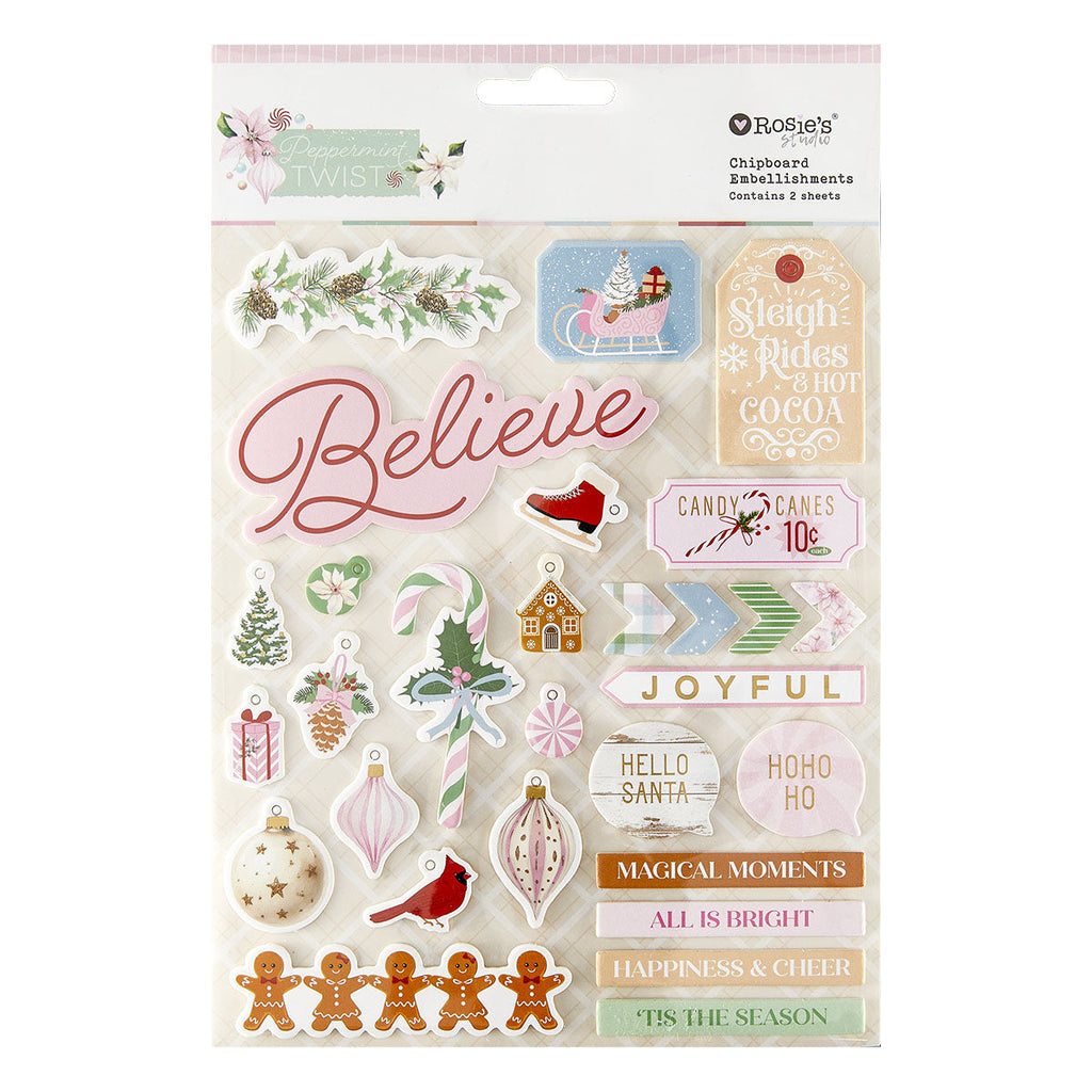 Rosie's Studio - Peppermint Twist Chipboard Stickers comes in a pack of two sheets that includes words, tags, sweet candy shapes, seasonal florals and other accents. These sturdy chipboard pieces make wonderful dimensional accents on any project!