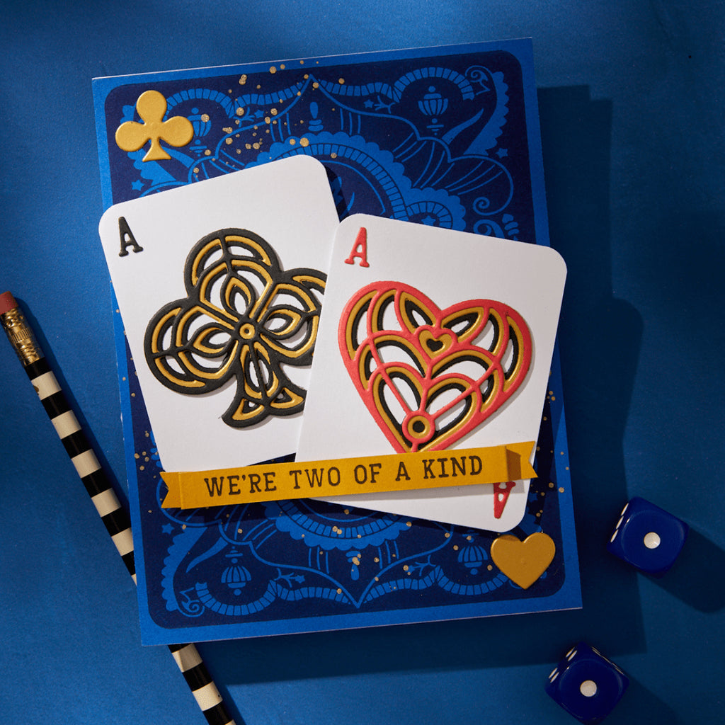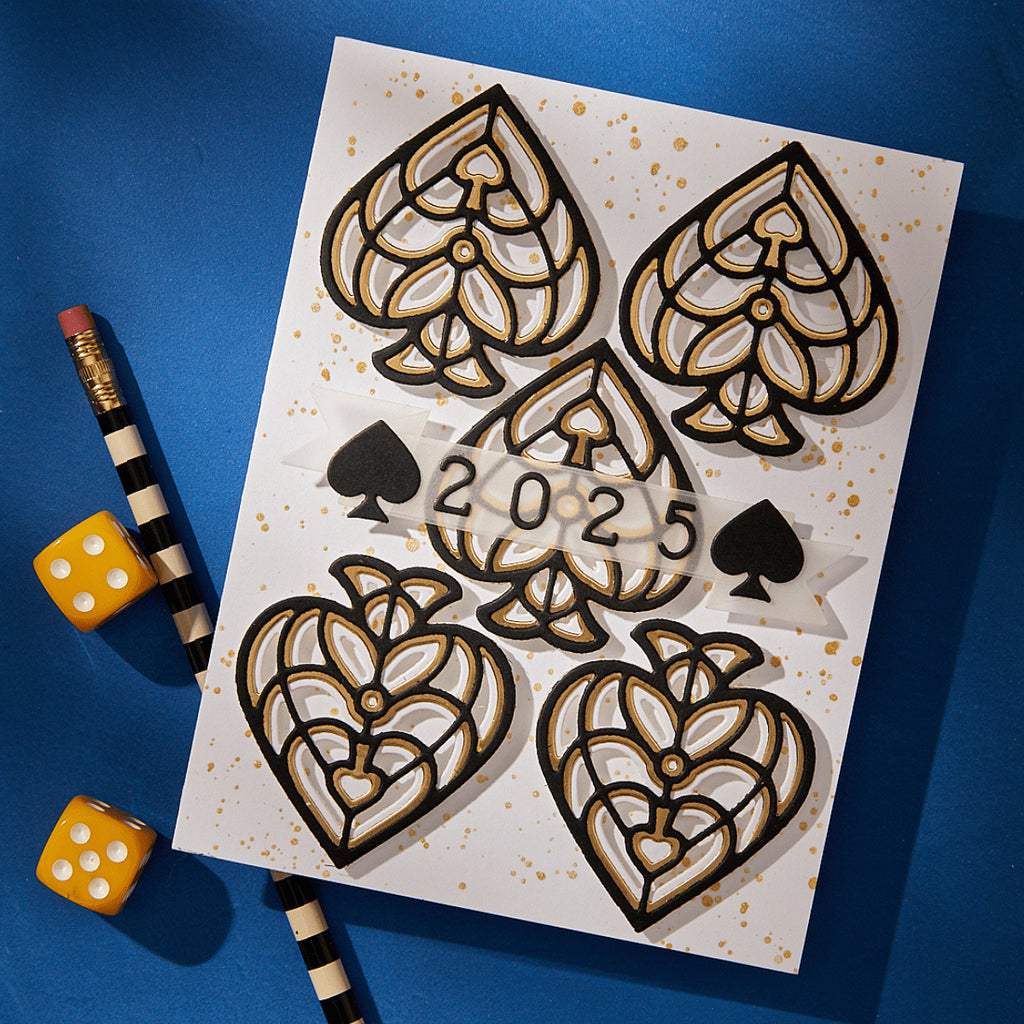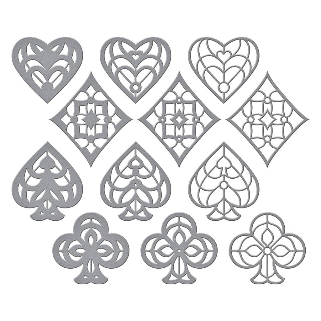 Kaleidoscope Noble Suits Etched Dies are part of the Jack of All Trades Collection by Jaycee Gaspar. Make an ornate and dimensional card suit motifs of the heart, diamond, spade and club for a unique element for your projects. Create a border or a repeat pattern as a background….stunning!
