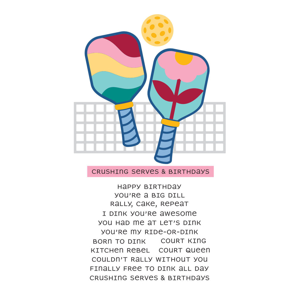 Born to Dink Clear Stamp & Die Set is part of the This is Life Collection. Design your own pickleball paddle and set it up with the ball and net in this set of 12 thin metal cutting dies. Add your punny sentiment with the clear stamp of 13 different choices with its coordinating strip die.
