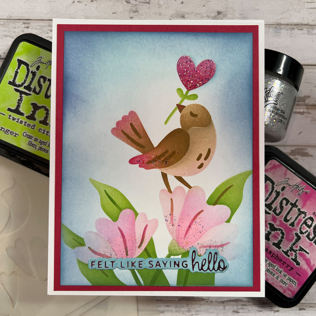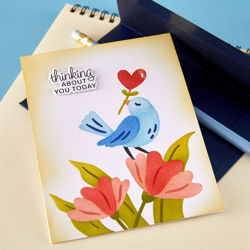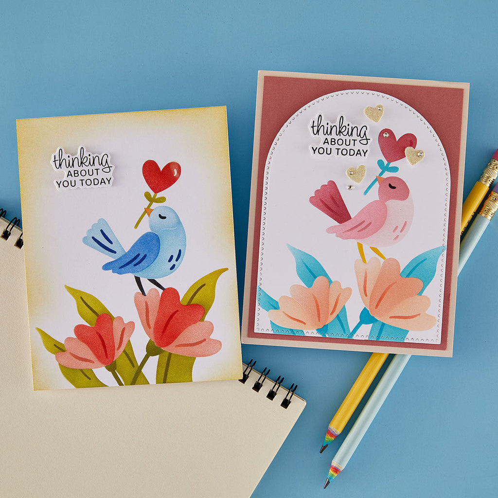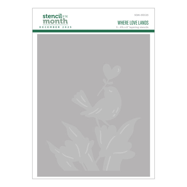 Let your sentiments take flight with Where Love Lands—the December 2025 Stencil of the Month. This 5-piece layering stencil set features a sweet songbird perched among blooms, holding a heart-tipped sprig in its beak. With bold florals and soft curves, it’s perfect for creating layered, love-filled scenes with charm and clarity.