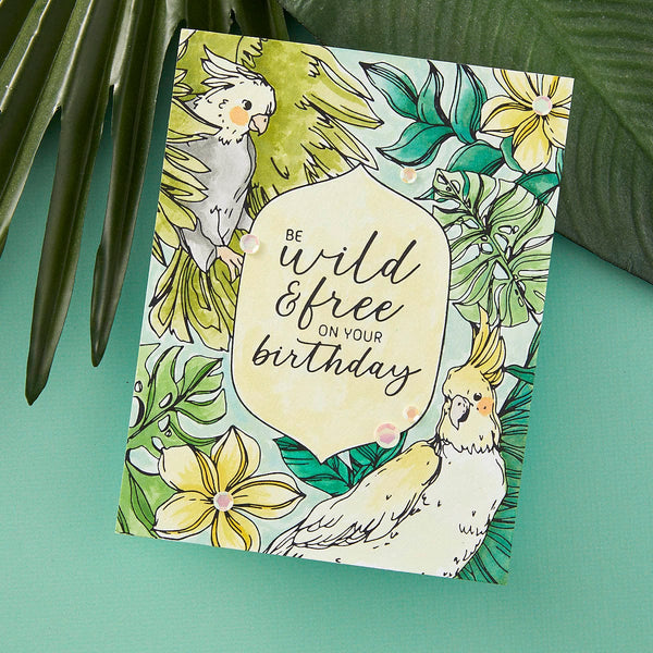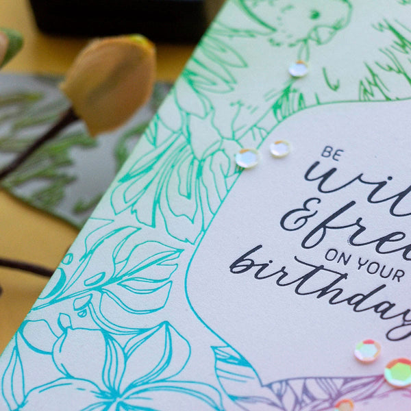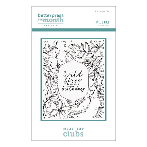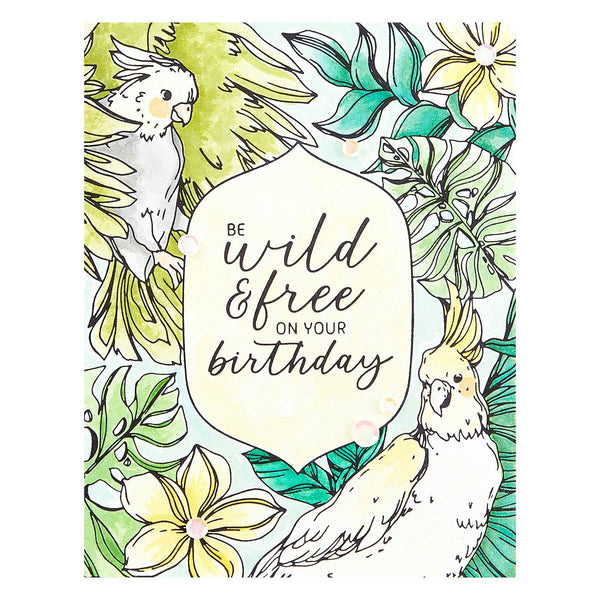 Wild & Free - BetterPress Plate of the Month - Released May 2024 to our BetterPress Plate the Month Club creates a tropical cardfront with a happy birthday sentiment. Use to create cards, décor, gift card holder, gifts, and more!