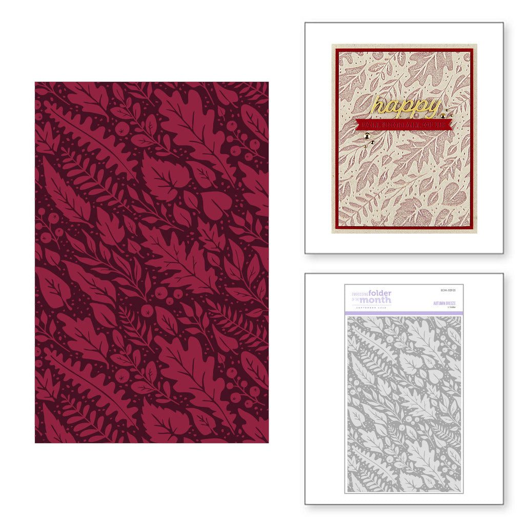 Let the beauty of fall sweep across your projects with the Autumn Breeze Embossing Folder of the Month. This elegant all-over design features a swirling mix of oak, maple, and fern leaves intertwined with delicate berries and branches, capturing the effortless movement of an autumn day.