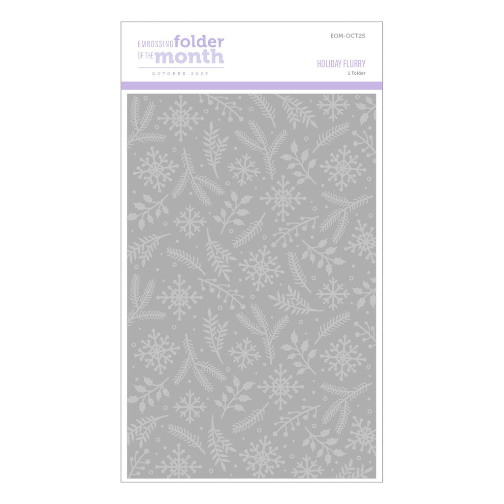 Add winter elegance to your projects with the Holiday Flurry Embossing Folder of the Month. This festive design features an intricate mix of snowflakes, pine branches, holly, and berriescreating a textured background that feels both classic and cozy.