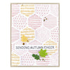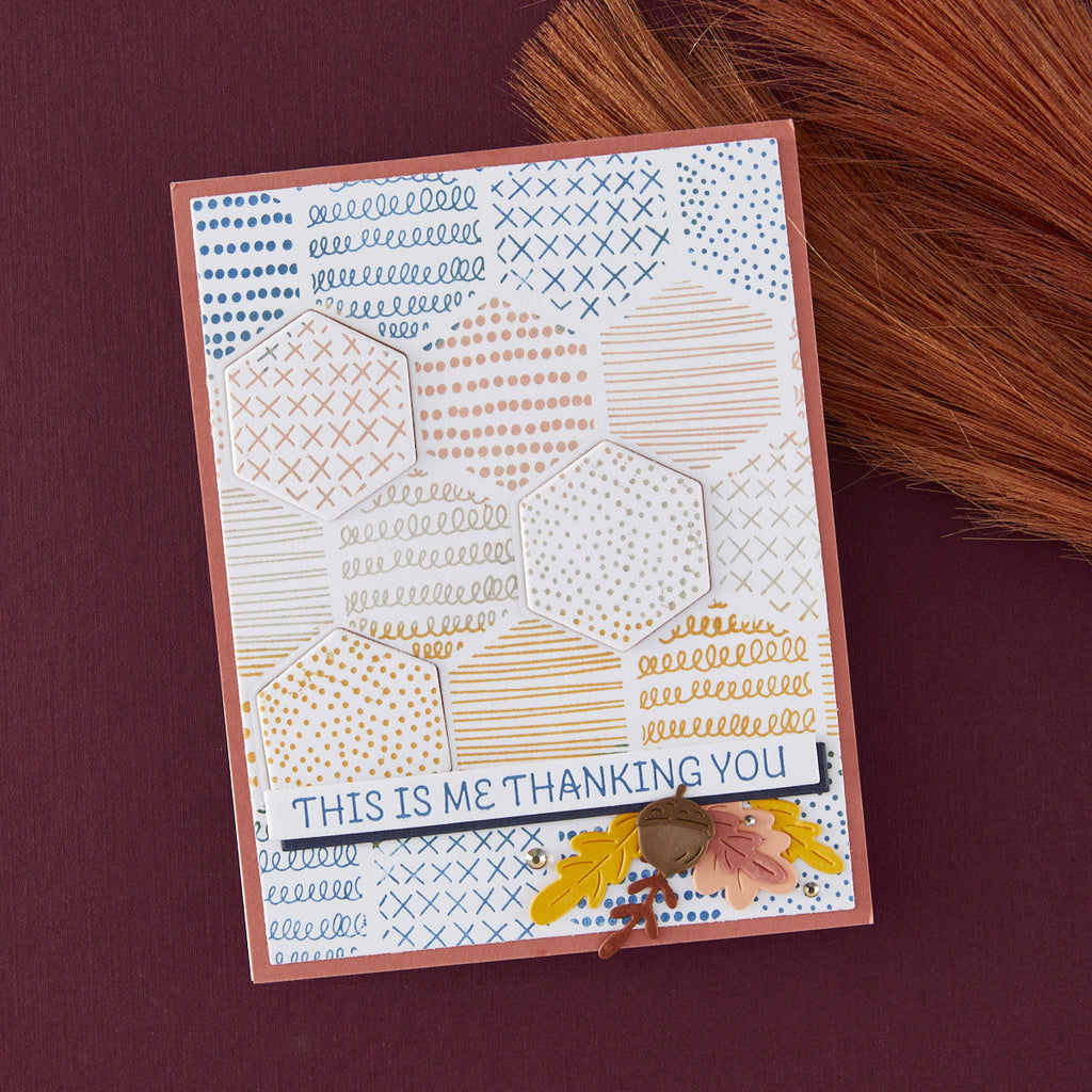 Add modern, homespun charm to your cards with the Sketchy Hexi BetterPress Plate Set. This playful design layers hand-drawn hexagons filled with whimsical stitched and doodled patterns, perfect for adding cozy detail to any seasonal or everyday project. Two coordinating sentimentsSending Autumn Cheer and This Is Me Thanking Youcomplete the set with warmth and versatility.
