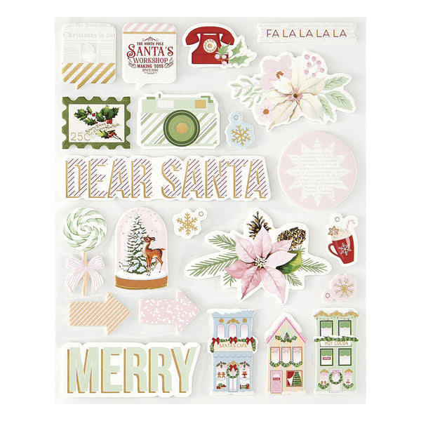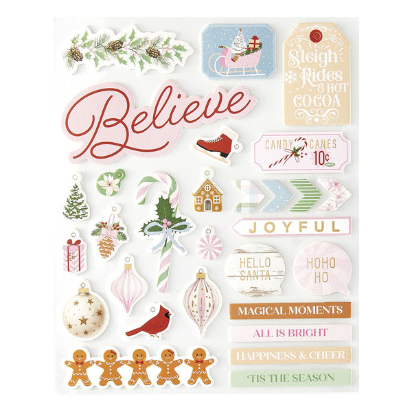 Rosie's Studio - Peppermint Twist Chipboard Stickers comes in a pack of two sheets that includes words, tags, sweet candy shapes, seasonal florals and other accents. These sturdy chipboard pieces make wonderful dimensional accents on any project!