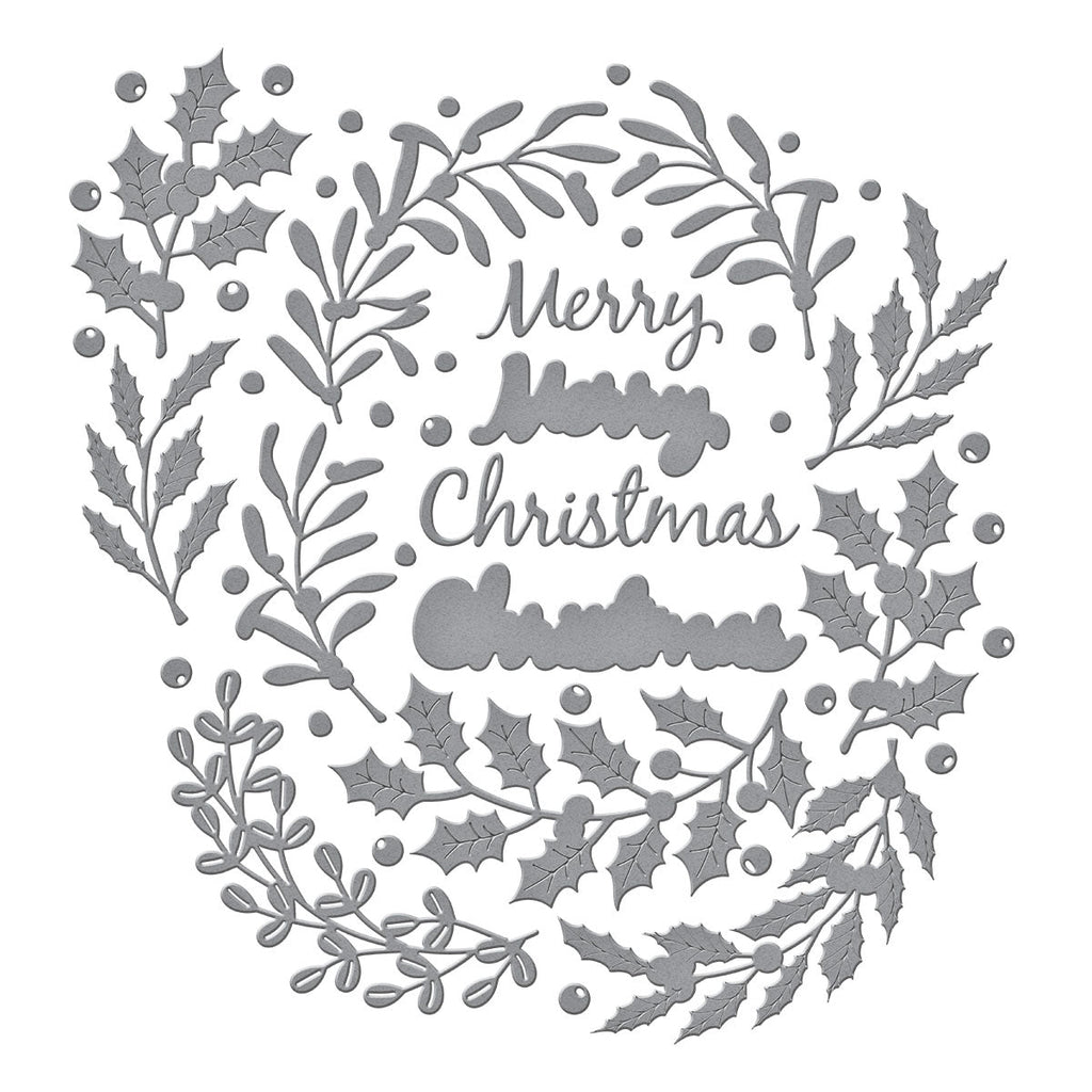 Seasonal Wreath Foliage Etched Dies are part of the Texture & Foliage Collection by Suzanne Hue. Using the set of 13 thin metal cutting die, you can create many kinds of wreaths in detail. Merry Christmas sentiment was also included in the set. A great way to celebrate the season!
