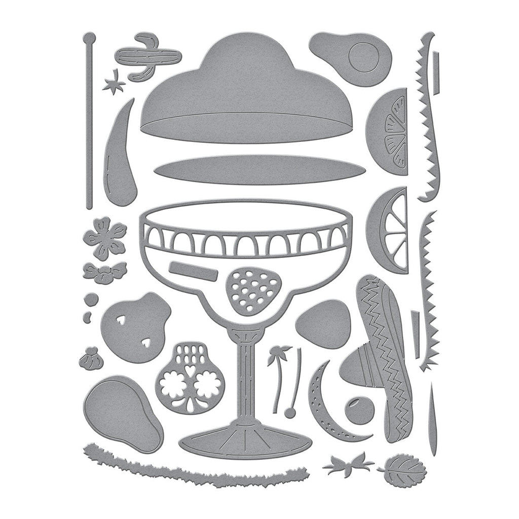 Sip Sip Ole Etched Dies are part of the Happier Hour Collection. When assembled, this set of 27 thin metal cutting dies creates festive drinks based on a stemmed wide rim Margarita glass. Details include a line of salt to set on the glass rim and plenty of garnishes to choose from. For extra fun, there are accents to add to set the vibe: sombrero, cactus, sugar skull, strawberry and more! Full of playful margarita puns, BP-337 Sip Sip Ole Sentiments BetterPress Plates. is sure to add the perfect finishing message to your project.