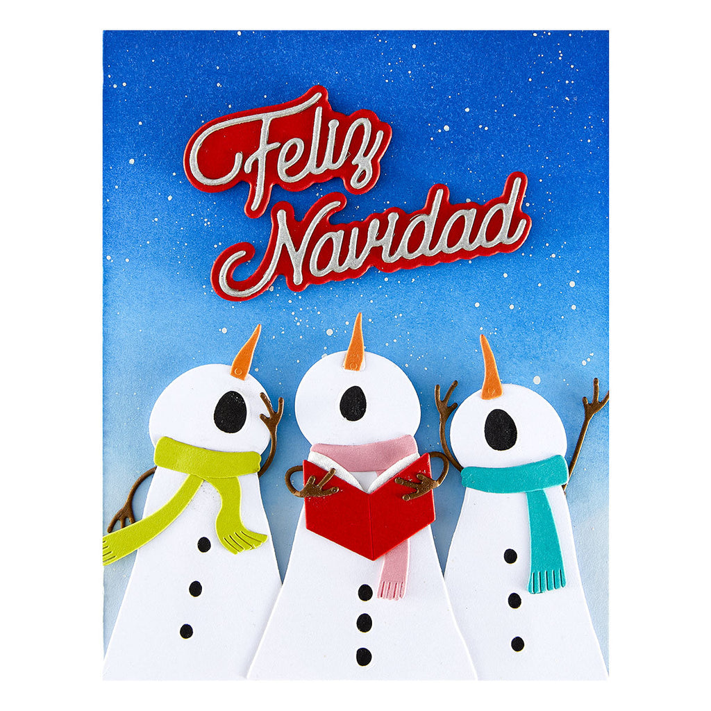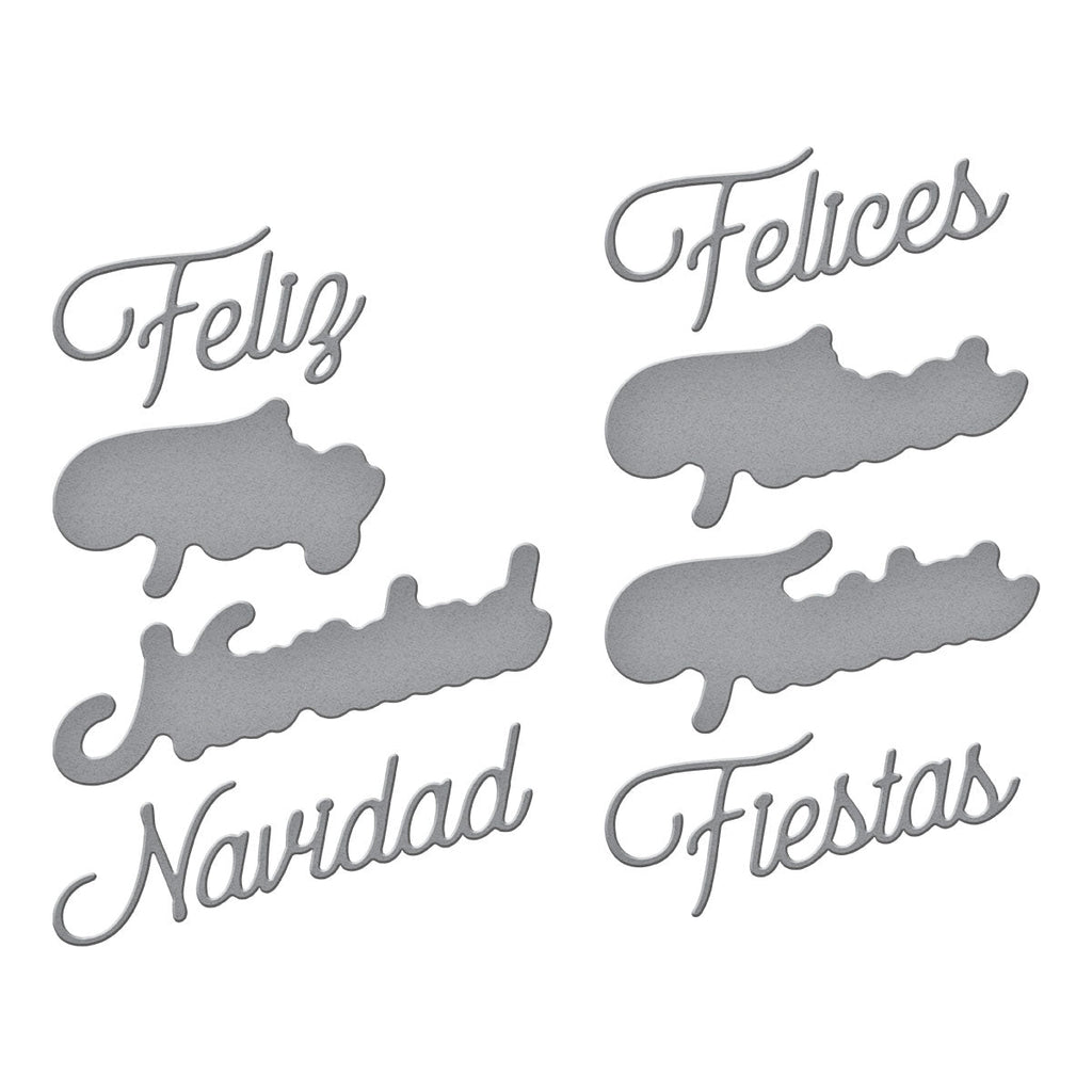 Spanish Holiday Sentiments Etched Dies are part of the International Holiday Sentiments Collection and the seasonal version of the International Sentiments Collection. This set of eight thin metal cutting dies cuts four sentiments with shadows for a bolder look. Sentiments include Feliz, Navidad, Felices and Fiestas.